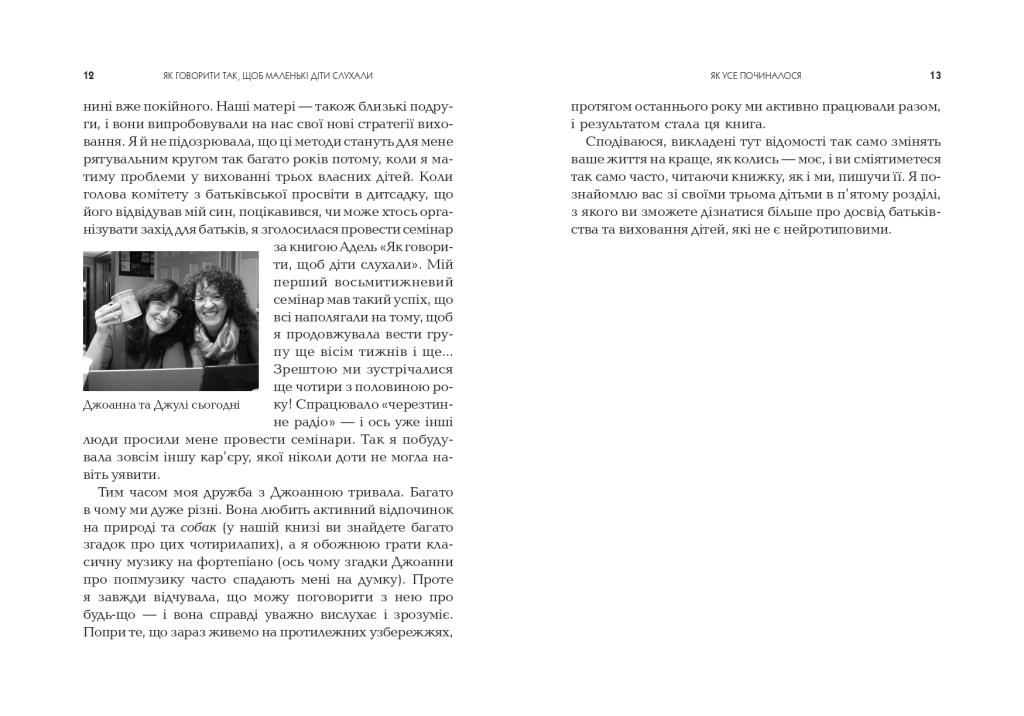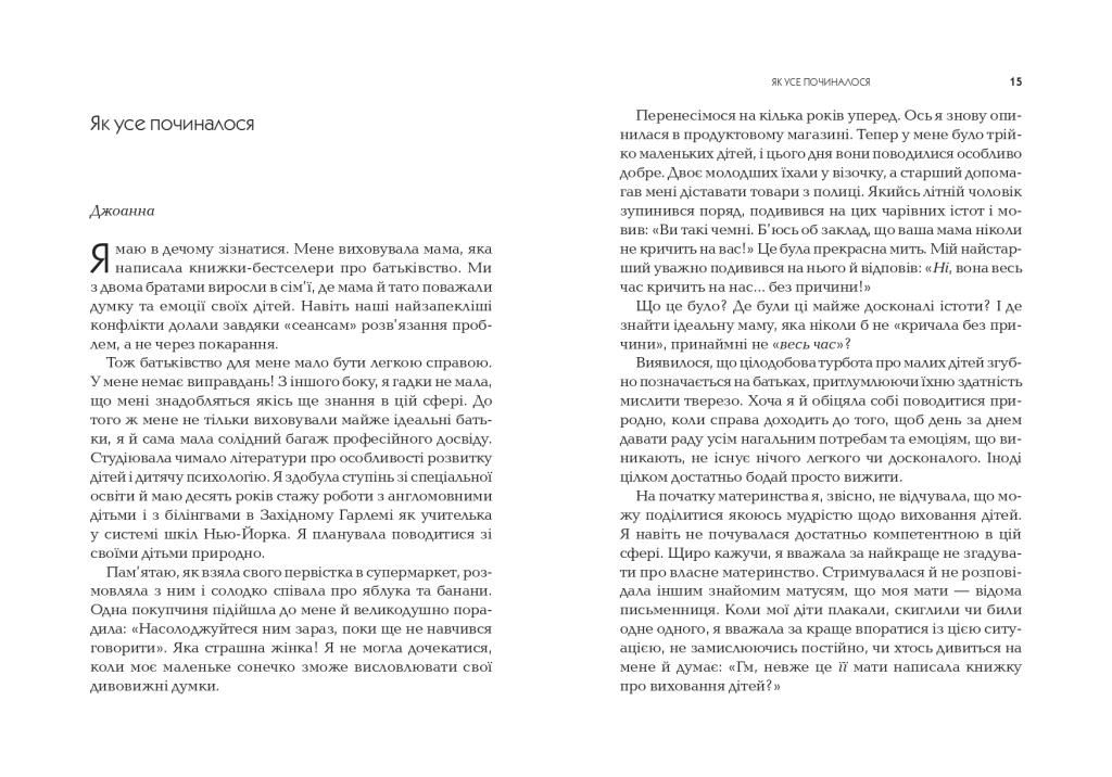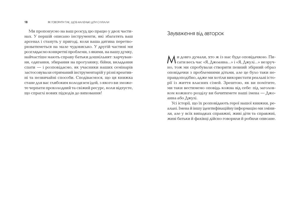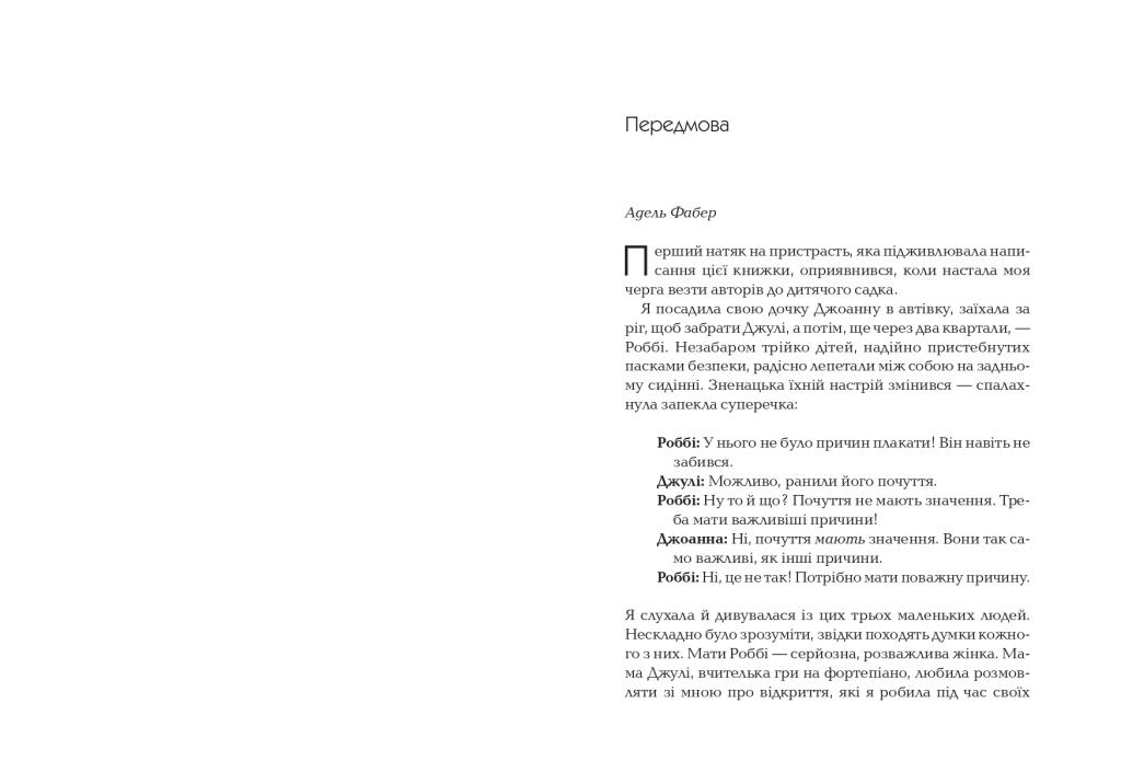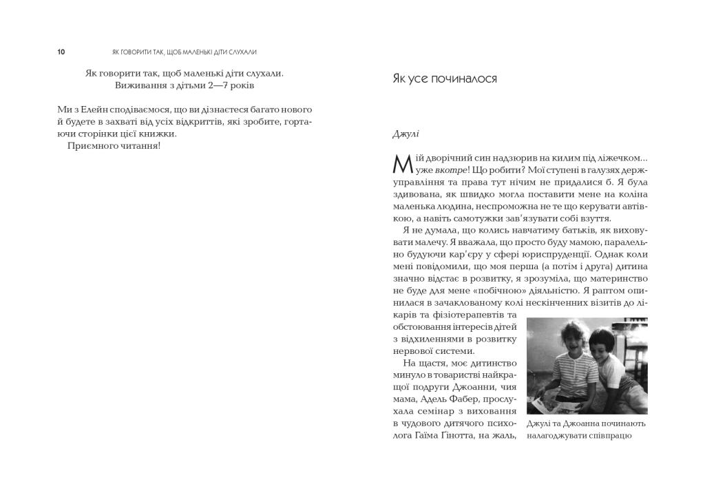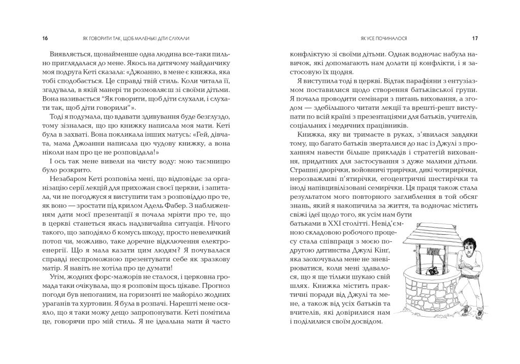 Дитина кричить і штовхається, не хоче чистити зуби та їсти овочі, кидається речами, бешкетує в супермаркеті та… не чує вас? Геть не чує… Джоанна Файбер і Джулі Кінґ — експертки з виховання — діляться своєю мудрістю, накопиченою протягом багатьох років проведення майстер-класів для батьків, учителів і педіатрів. Завдяки новаторському поєднанню оповідок з робочої практики, батьківських історій та авторських спостережень ви отримаєте конкретні інструменти й поради. Вони змінять ваші стосунки з дітьми й навчать говорити так, що малеча слухатиме вас із зацікавленістю та щирим інтересом. А ще книжка допоможе маленьким дітям стати самодостатніми дорослими, які з розумінням і повагою ставляться до своїх батьків, учителів, старших братів/сестер й однолітків. Читаючи книжку, батьки відчують, що не самотні в складному спілкуванні з маленькими впертими дітлахами, які не хочуть чистити зуби, задираються до інших дітей та (як може помилково здатися) не піддаються жодним методикам виховання.