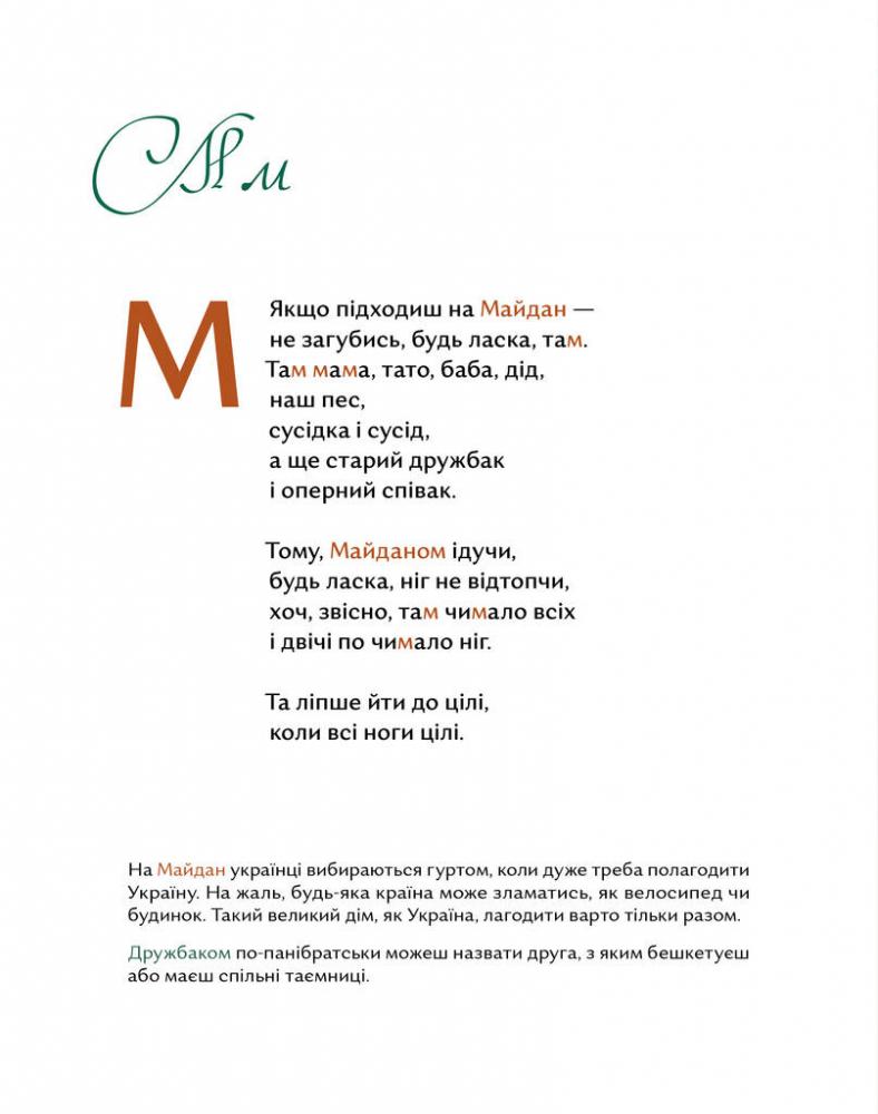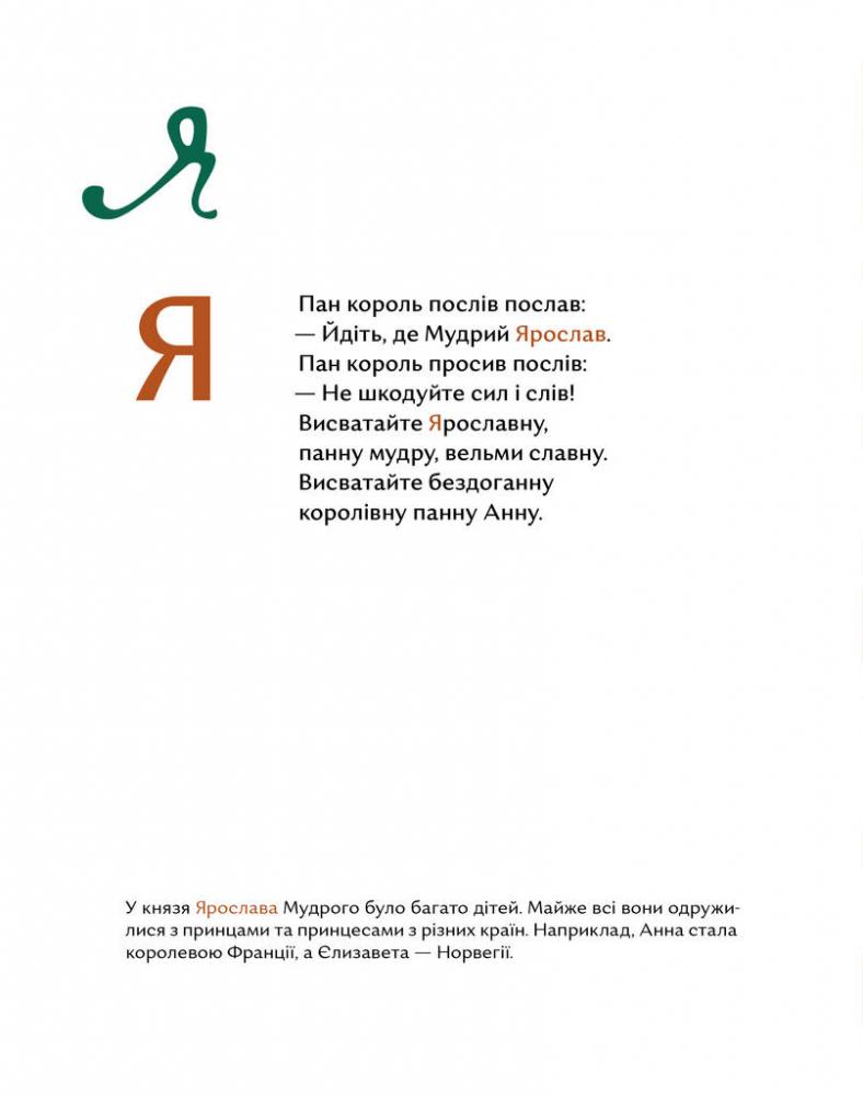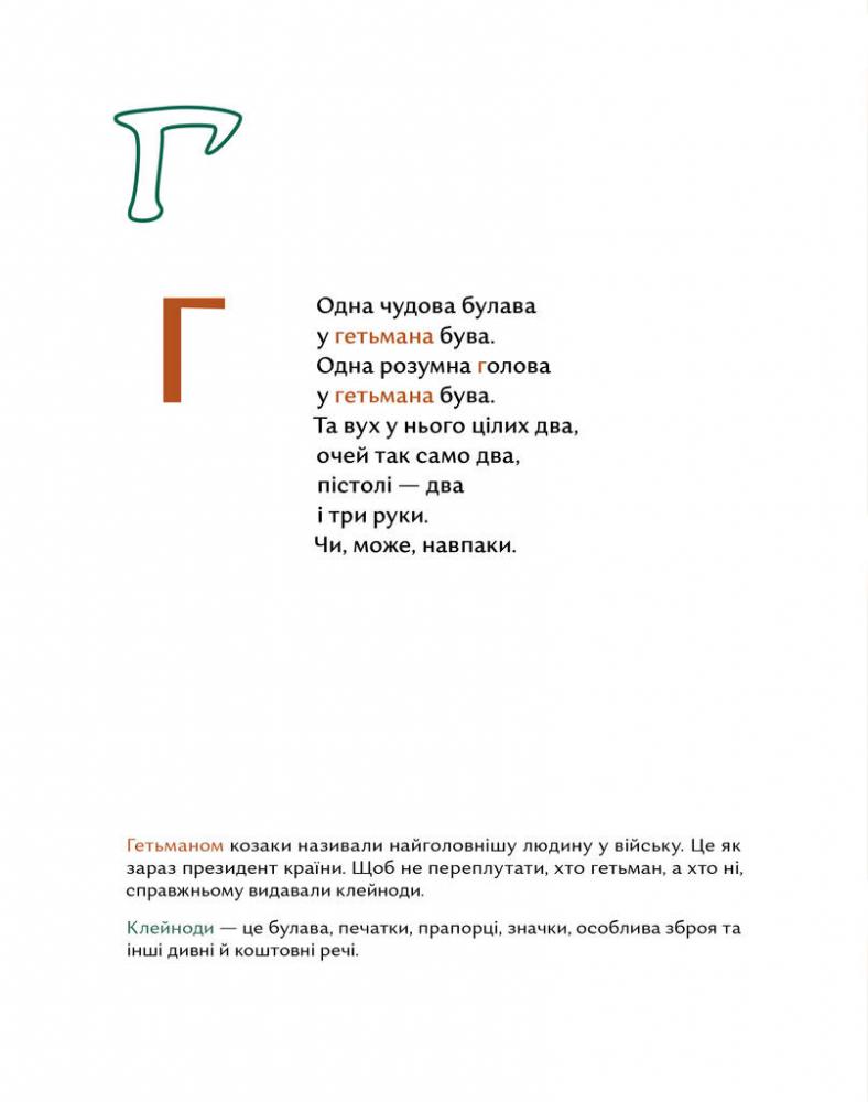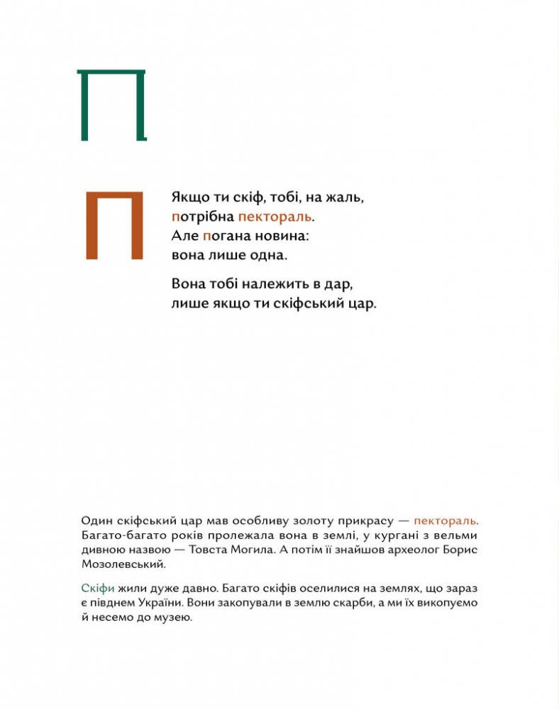 За кожною літерою ховаються важливі слова, а за словами - події, постаті, речі, які зробили Україну саме такою, як ми знаємо. Ця абетка пропонує легке, пізнавальне, веселе знайомство з історичними поняттями і нагоду поговорити з дітьми про знакові явища з історії наших теренів. Унікальність видання – це складові, що допомагають дорослим знайти правильні слова для обговорення психологічних моментів з дітьми та глибшого розуміння історичного контексту: друкована книжка детальний бекґраунд за QR-кодом ігрова закладка