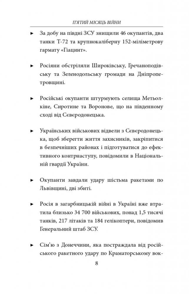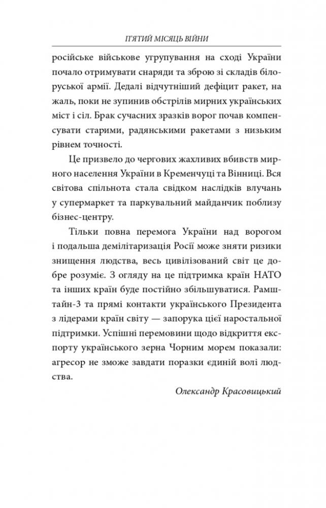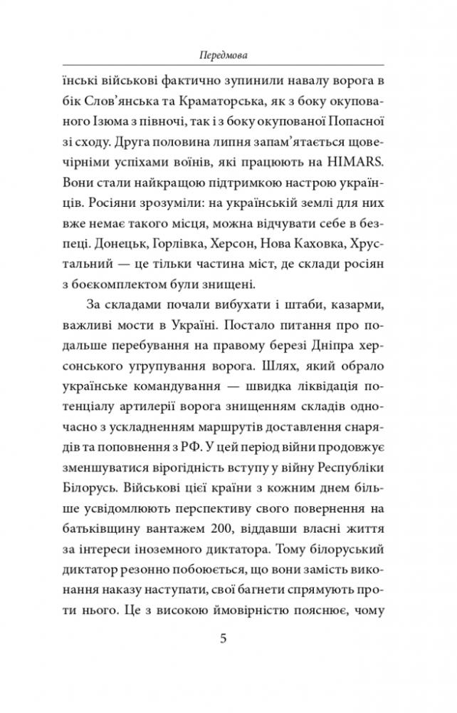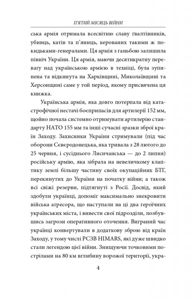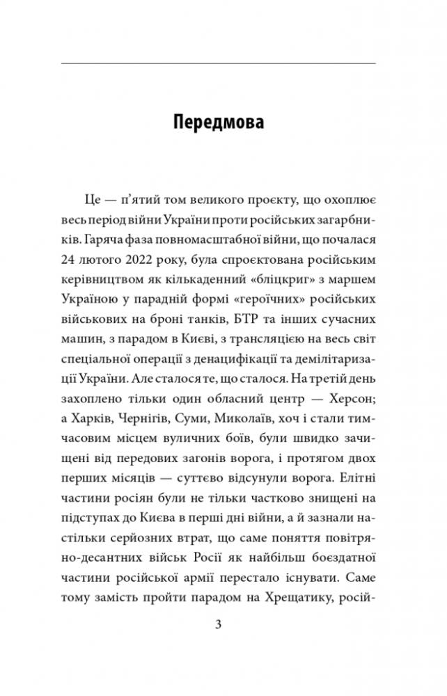 Це п’ятий том великого проєкту, що охоплює весь період війни України проти російських загарбників. Гаряча фаза повномасштабної війни, що почалася 24 лютого 2022 року, була спроєктована російським керівництвом як кількаденний бліцкриг з маршем Україною у парадній формі «героїчних» російських військових на броні танків, БТР та інших сучасних машин, з парадом в Києві, з трансляцією на весь світ спеціальної операції з денацифікації та демілітаризації України. Але замість пройти парадом на Хрещатику, російська армія отримала всесвітню славу ґвалтівників, убивць, катів та п’яниць.Ця армія з ганьбою залишила північ України. Маючи десятикратну перевагу над українською армією в техніці, вона була зупинена та відкинута на Харківщині, Миколаївщині та Херсонщині саме в той період, якому присвячена ця книжка.