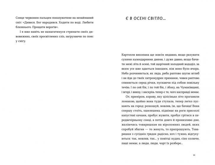 Кожна новела Сергія Осоки — то маленька велика історія простої людини, яку, можливо, ніхто б і не помітив на цій землі, якби не уважний майстер слова. Бо він не просто пише, а створює кількома мазками тривимірну картину людського життя: здається, можна прислухатися і почути, як шелестить очерет, сплескує риба в ставку, як падають яблука, риплять старі двері, як змішується з вітром людське зітхання, приглушений сміх чи схлип. А ще можна відчути запахи — то густі і щільні, аж забиває памороки, то леткі і прозорі, як аромат квітки. Десь у цьому 3D-форматі можна побачити людину, з усіма її прекрасними і потворними рисами, з шорсткими поверхнями і глибокими западинами її бентежної душі. Здається, сюжети цих новел малі чи другорядні, але то лише ключ, який відкриває портал, через який потрапляєш у світ великої літератури.