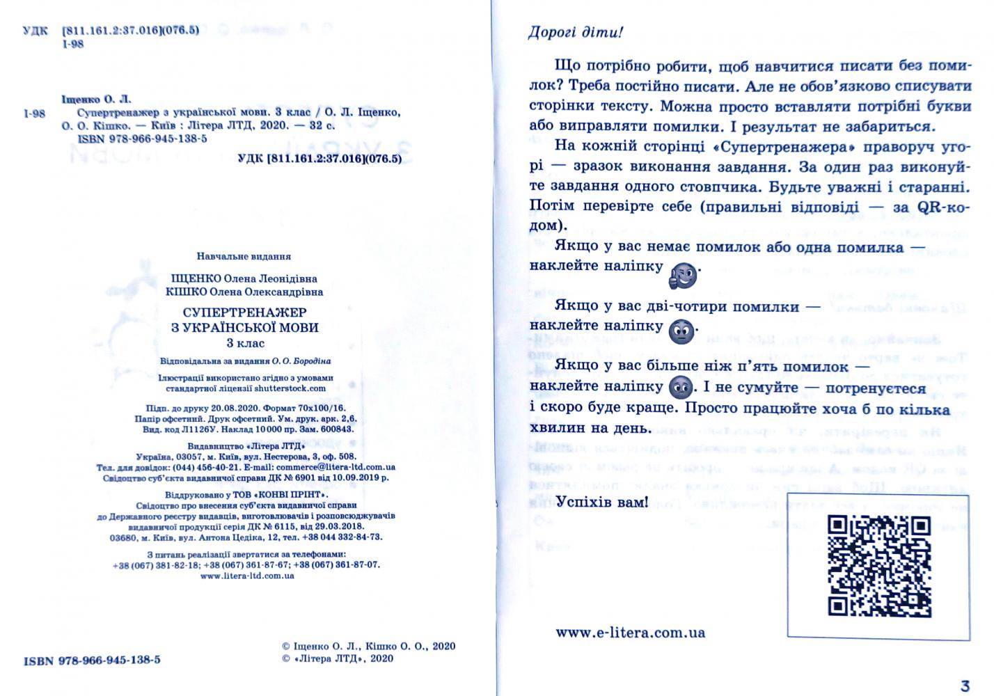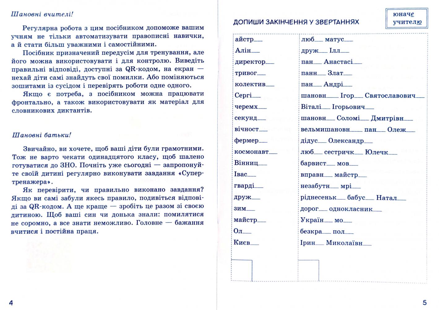 Регулярна робота з цим посібником допоможе вашим учням не тільки автоматизувати правописні навички, а й стати більш уважними і самостійними. Посібник призначений передусім для тренування, але його можна використовувати і для контролю. Виведіть правильні відповіді, доступні за QR-кодом, на екран — нехай діти самі знайдуть свої помилки. Або поміняються зошитами із сусідом і перевірять роботи одне одного. Якщо є потреба, з посібником можна працювати фронтально, а також використовувати як матеріал для словникових диктантів.