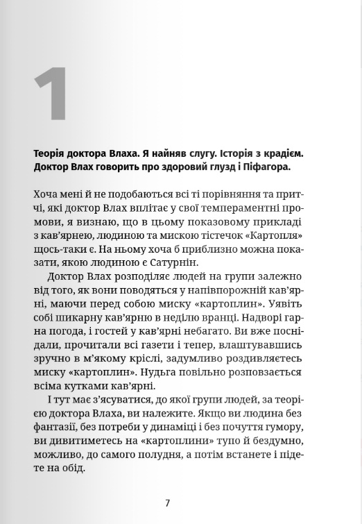 Доктор Влах поділяє всіх людей на три групи, залежно від того, як би вони поводились лінивого недільного поранку в кав’ярні, добряче поснідавши і отримавши на десерт миску тістечок-«картоплин». Люди з першої групи — без фантазії і без почуття гумору — бездумно дивитимуться на «картоплини» мало не до самого полудня. Люди з другої — почнуть моделювати ситуацію, за якої хтось із гостей кав’ярні раптом почне бомбардувати «картоплинами» інших відвідувачів. А до третьої, найменш чисельної групи можна віднести тих, кого думка про «картоплини», що літають в повітрі, настільки захоплює, що вони встають і беруться її реалізовувати. Саме такою людиною є Сатурнін — слуга, якого легковажно взяв на роботу оповідач цієї книжки. І наслідки не забарились.