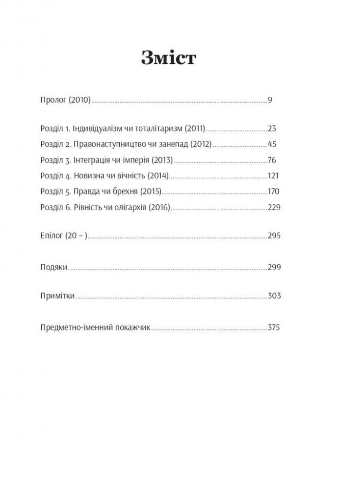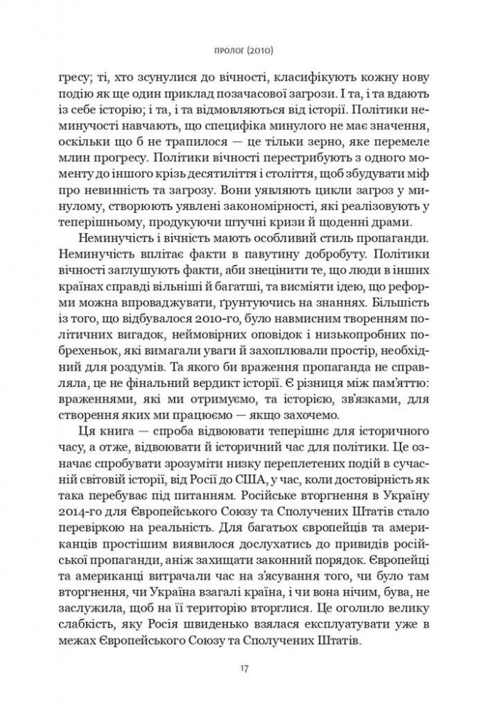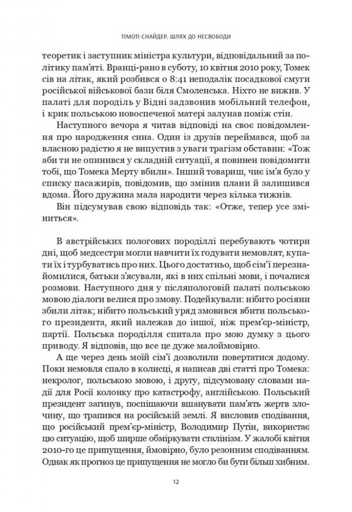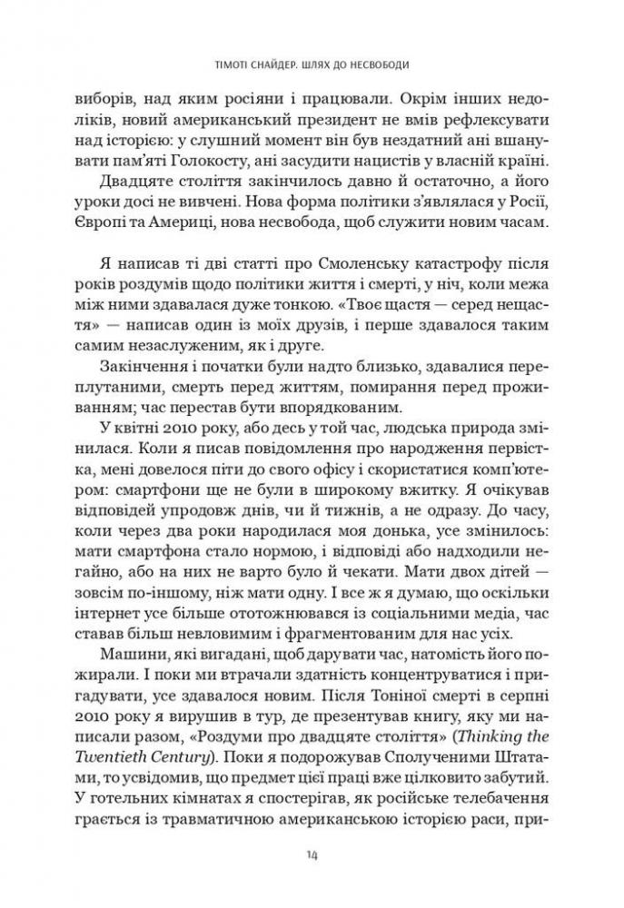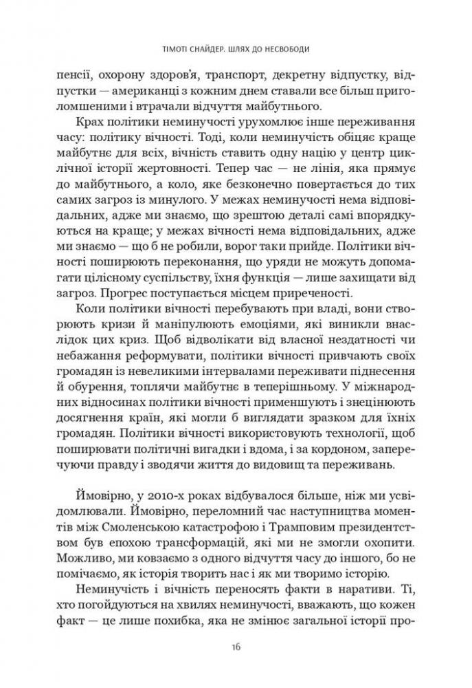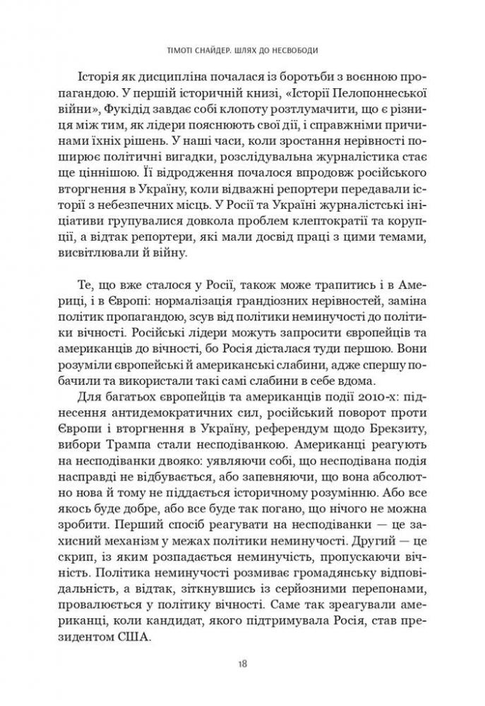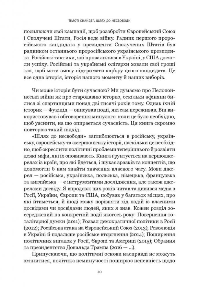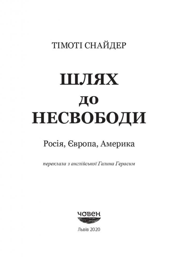 «Шлях до несвободи» – одна із найважливіших для українського читача книг Тімоті Снайдера, бо вона про нас, про історію, свідками й учасниками якої ми є тут і тепер. Це книжка про події, політичні фігури та глобальні ідеї, які приховані за цими подіями. Тімоті Снайдер аналізує складні та драматичні трансформації в Росії, Україні, Європі та США від 2011 до 2016 року. Серед головних подій – російські протести на Болотній площі в Москві, Революція Гідності в Україні, анексія Криму та вторгнення Росії на Донбас, криза біженців, Брекзит і перемога Дональда Трампа на президентських виборах у США. Тімоті Снайдер не лише ставить питання про те, чому ж ідея «кінця історії» була помилковою. Він доводить, як закладена в «кінець історії» неуникність, або ж, іншими словами, думка про те, що «ідеї не мають значення», могла докластися до створення сучасного політичного клімату.