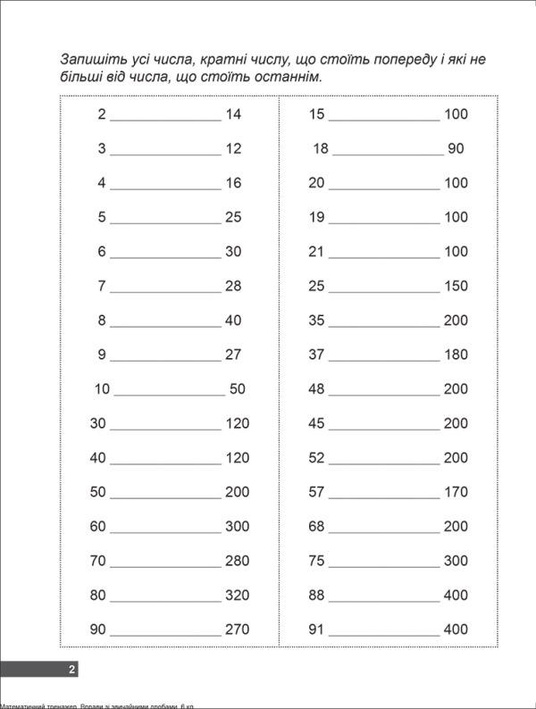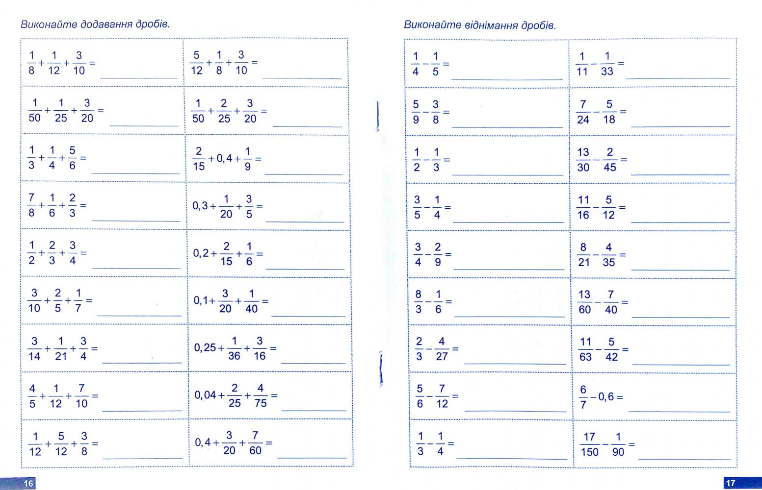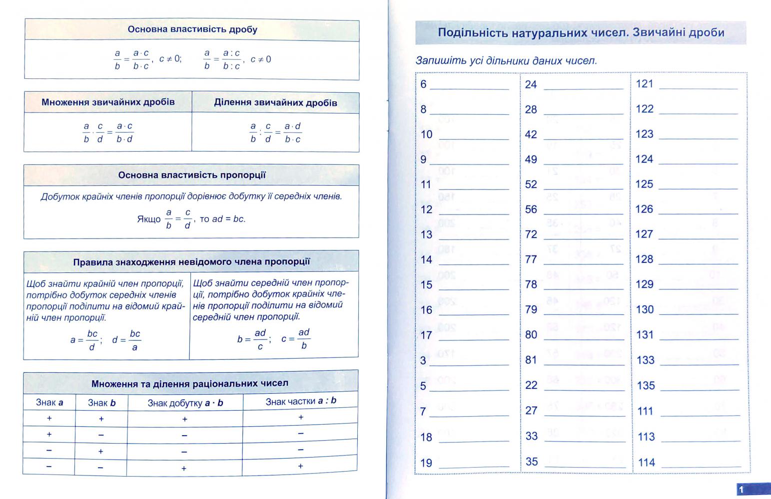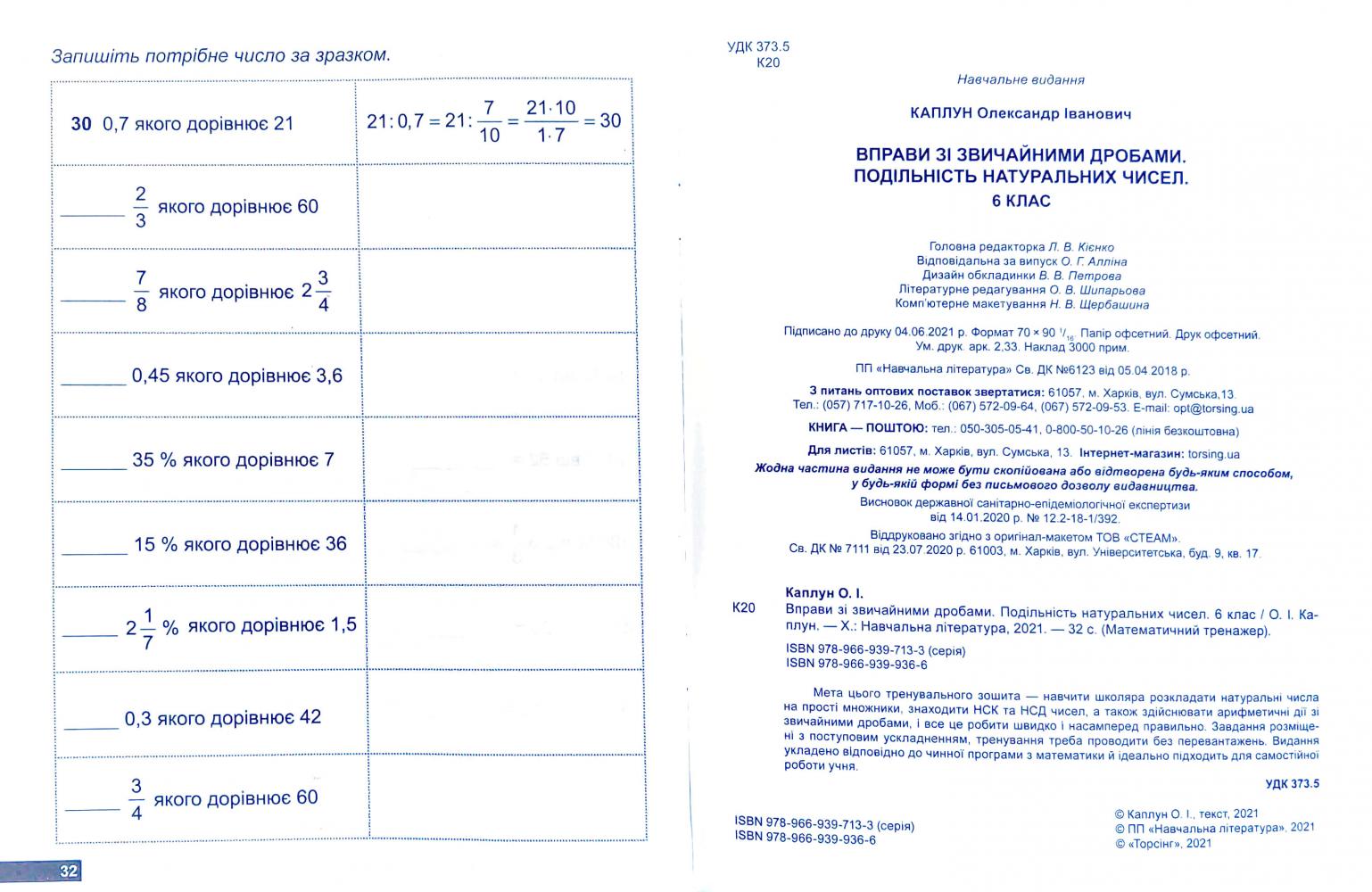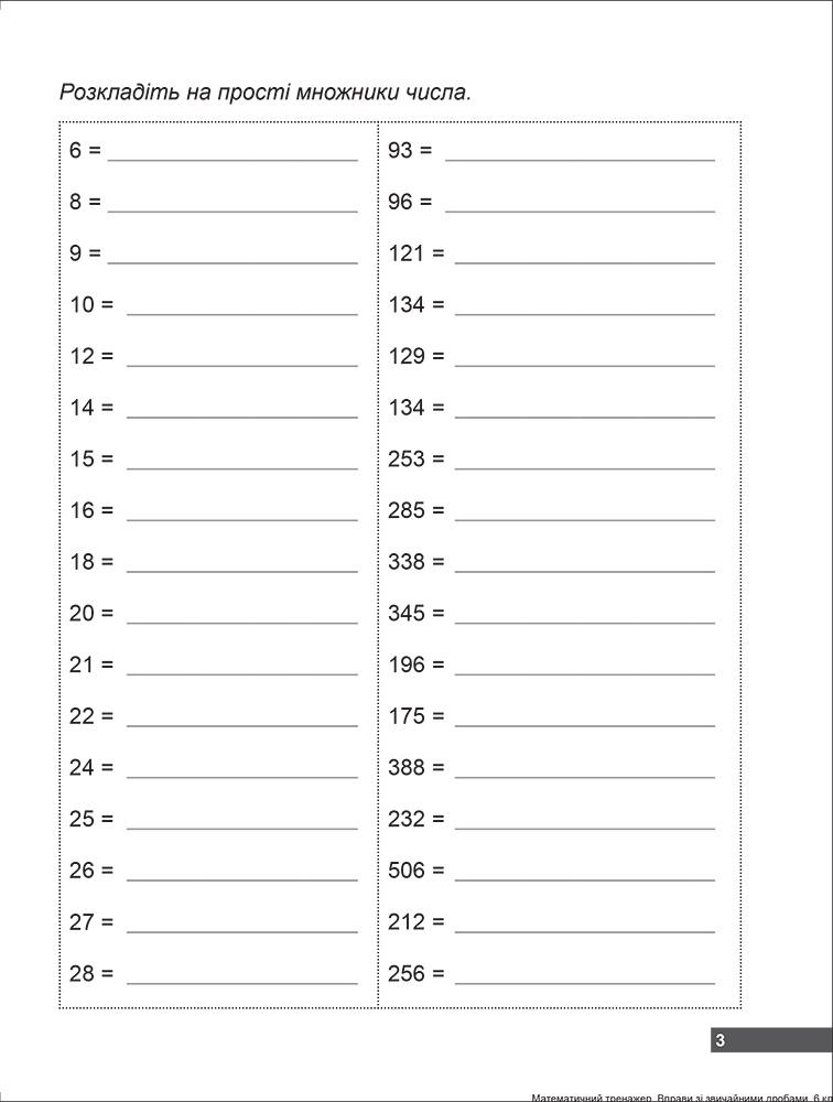 Мета цього тренувального зошита - навчити школяра розкладати натуральні числа на прості множники, знаходити НСК та НСД чисел, а також здійснювати арифметичні дії зі звичайними дробами, і все це робити швидко і насамперед правильно. Завдання розміщені з поступовим ускладненням, тренування треба проводити без перевантажень. Видання укладено відповідно до чинної програми з математики й ідеально підходить для самостійної роботи учня.