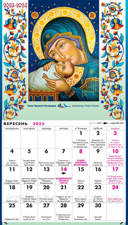 Новий церковний календар на 2023 (з 1 вересня) -2024 рік. Він допоможе Вам зорієнтуватися на який день припадають перехідні та неперехідні церковні свята, коли дозволена будь-яка їжа, коли розпочинаються та закінчуються пости. Він також нагадає вам про святих Церкви і допоможе не забути привітати іменинників.