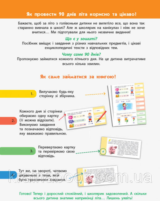 Тепер не потрібно вмовляти дитину займатися влітку! Із книгами «90 днів літа» можна за кілька хвилин на день повторити шкільний матеріал за попередній клас та розширити кругозір. Дізнавайтеся нове про українську та світову культуру, архітектуру, історію, науку, мистецтво. Опрацювання однієї картки займе не більше 5 хвилин на день. Як наслідок — дитина повторить вивчене і дізнається багато нового.