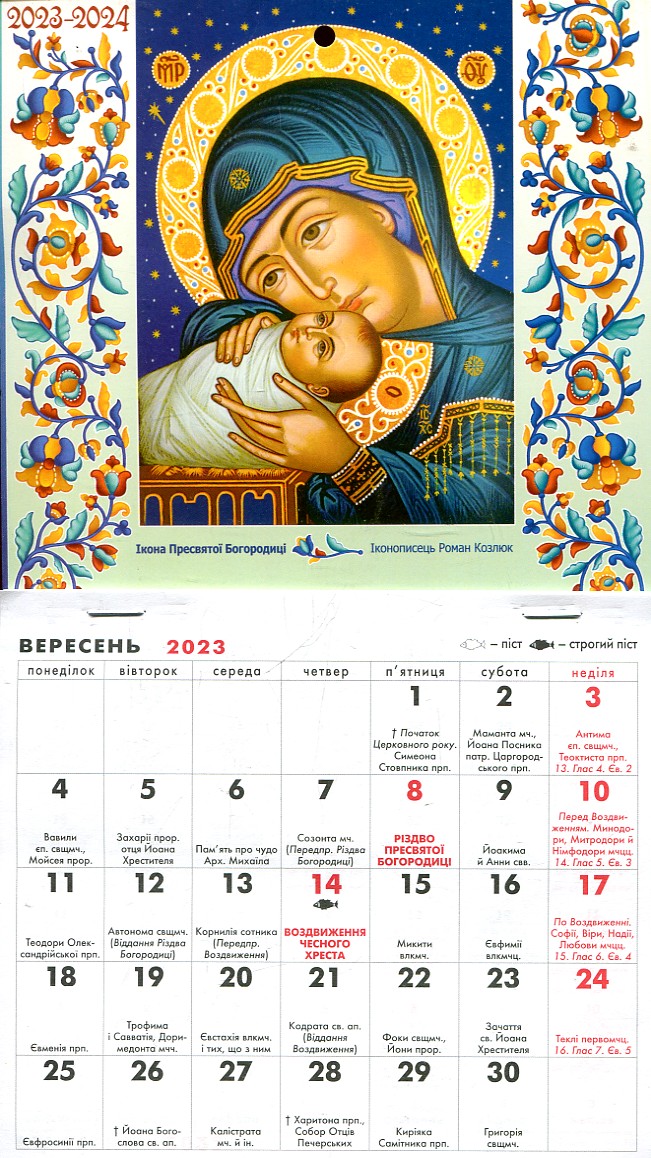 Новий церковний календар на 2023 (з 1 вересня) -2024 рік. Він допоможе Вам зорієнтуватися на який день припадають перехідні та неперехідні церковні свята, коли дозволена будь-яка їжа, коли розпочинаються та закінчуються пости. Він також нагадає вам про святих Церкви і допоможе не забути привітати іменинників.