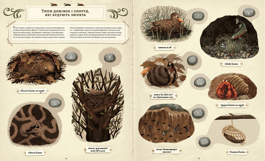 Виявляється, і серед тварин є дизайнери, інженери, конструктори, будівельники та справжні архітектори. У чудово проілюстрованій книжці Емілії Дзюбак дізнаєтеся про справжні підземні мегаполіси та наземні споруди, невеличкі гніздечка та «багатоквартирні» комплекси, будиночки на воді та під водою, переносні й тимчасові житла. Усі ці споруди – справа рук звірят, птахів та комах – справжніх майстрів-будівничих, які добре знаються на будівельних матеріалах, безпеці та затишку власних помешкань. Для усіх, хто цікавиться світом тварин та природою.
