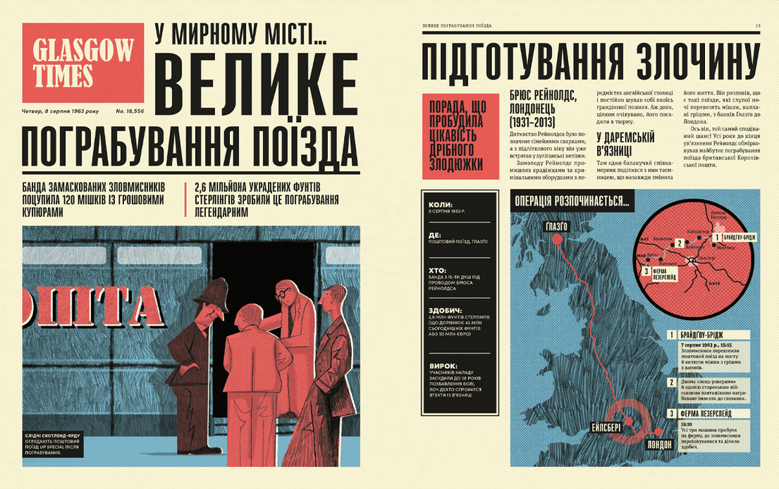 У цій книжці відтворено правдиву хроніку подій, подробиці планування, місце пограбувань та тривалі поліцейські розслідування. Кожен розділ — цікава інфографіка, присвячена одному з легендарних пограбувань, оригінально презентована і здизайнована за обкладинками преси того часу.