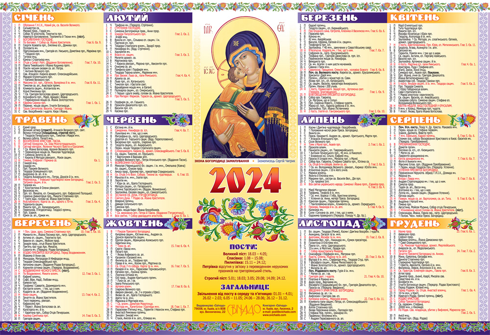Настінний церковний календар на 2024 малого формату. Він допоможе Вам зорієнтуватися на який день припадає Великдень у 2024 році, перехідні та неперехідні церковні свята, коли дозволена будь-яка їжа, коли розпочинаються та закінчуються пости. Він також нагадає вам про святих Церкви і допоможе не забути привітати іменинників.