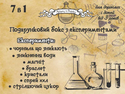 Подарунковий бокс з експериментами 7 в 1 Alchemy in podolico - дані бокси допомагають вашій дитині краще засвоїти науку і пізнати світ. Цей набір містить такі експерименти: кристали зникнення води зникння чорнила браслет магніт стріляючий цукор спрей ххл У комплект входить інструкція, яка докладно описує експерименти. Зроблено в Україні з американських інгредієнтів. Також спробуйте інші набори експериментів _ це захоплююче та весело.