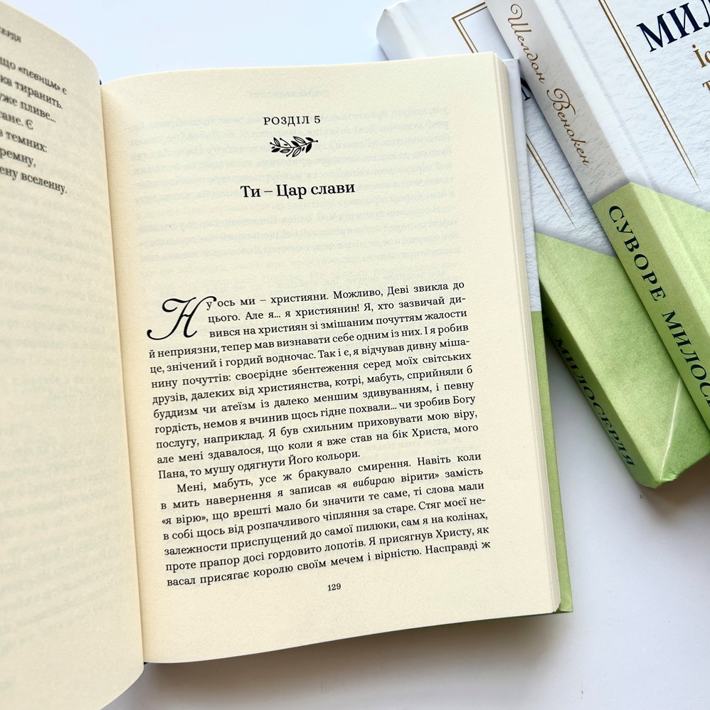 Суворе милосердя” – це автобіографічна книга Шелдона Венокена про зіткнення страждання і віри. Можна сказати, що ця книга – про різницю між тим, як ми уявляємо собі, що може статися, і тим, як це відбувається насправді. І, звісно, вона про роль Бога у нашому житті. Це зворушлива розповідь про шлюб автора, пошуки віри та дружбу з К. С. Люїсом, 18 листів якого читач знайде у цій книзі. Вона про велику духовну силу, яка підтримувала Шелдона Венокена після передчасної смерті його коханої дружини. Ця книга для всіх — віруючих і невіруючих, тих, хто закоханий, хто будує стосунки, шукає правду, зростаючи у вірі. Вона для тих, хто пережив втрату, і тих, хто страждає. Ця книга – для тих, хто любить правду і не боїться її шукати.