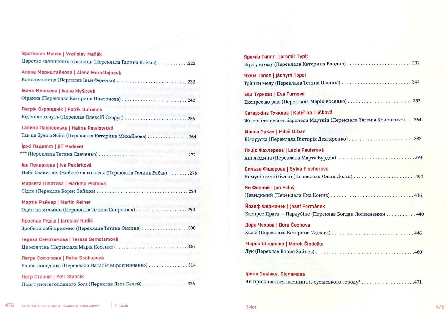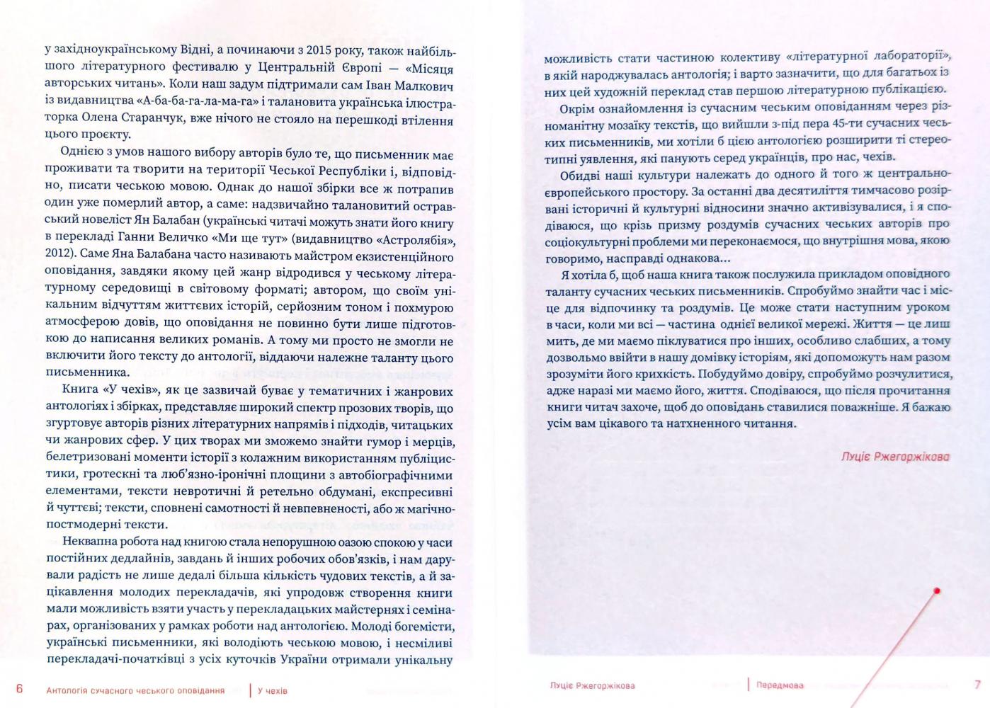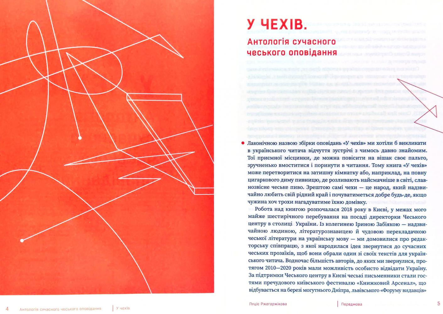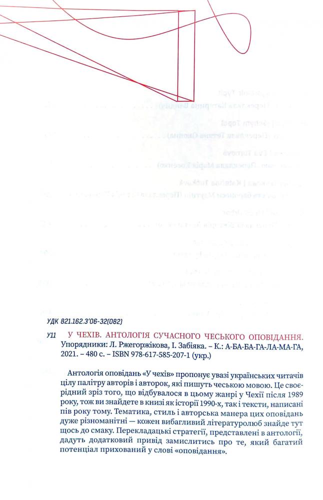 Антологія оповідань «У чехів» пропонує увазі українських читачів цілу палітру авторів і авторок, які пишуть чеською мовою. Це своєрідний зріз того, що відбувалося в цьому жанрі у Чехії після 1989 року, тож ви знайдете в книзі як історії 1990-х, так і тексти, написані пів року тому. Тематика, стиль і авторська манера цих оповідань дуже різноманітні — кожен вибагливий літературолюб знайде тут щось до смаку. Перекладацькі стратегії, представлені в антології, дадуть додатковий привід замислитись про те, який багатий потенціал прихований у слові «оповідання».