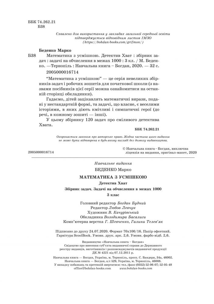 “Математика з усмішкою” — це серія невеликих збірників задач і робочих зошитів для початкової школи (з назвами посібників цієї серії можна ознайомитися на останній сторінці обкладинки).