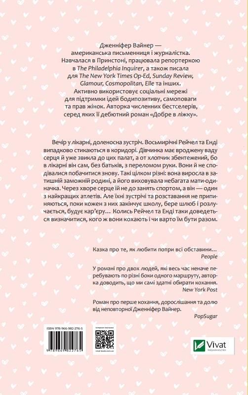 Вечір у лікарні, доленосна зустріч. Восьмирічні Рейчел та Енді випадково стикаються в коридорі. Дівчинка має вроджену ваду серця й уже звикла до цих палат, а от хлопчик збентежений, бо в лікарні він сам, без батьків, з переломом руки. Вони й не сподівалися побачитися знову. Такі цілком різні: вона виросла в затишній заможній родині, а його виховувала небагата мати одиначка. Через хворе серце їй не до занять спортом, а він — один з найкращих атлетів. Але їхні зустрічі та розставання не припиняються, поки кожен з них закінчує школу, бере шлюб і розлучається, будує кар’єру… Колись Рейчел та Енді таки доведеться визначитися, кого ж вони кохають і чи варто їм бути разом. Про автора: Дженніфер Вайнер — американська письменниця і журналістка. Навчалася в Принстоні, працювала репортеркою в The Philadelphia Inquirer, а також писала для The New York Times Op-Ed, Sunday Review, Glamour, Cosmopolitan, Elle та інших. Активно використовує соціальні мережі для підтримки ідей бодипозитиву, самоповаги та прав жінок. Авторка численних бестселерів, серед яких її дебютний роман «Добре в ліжку».