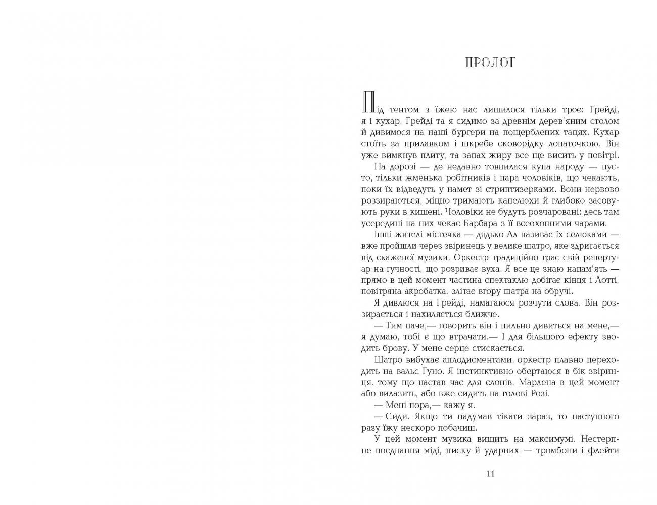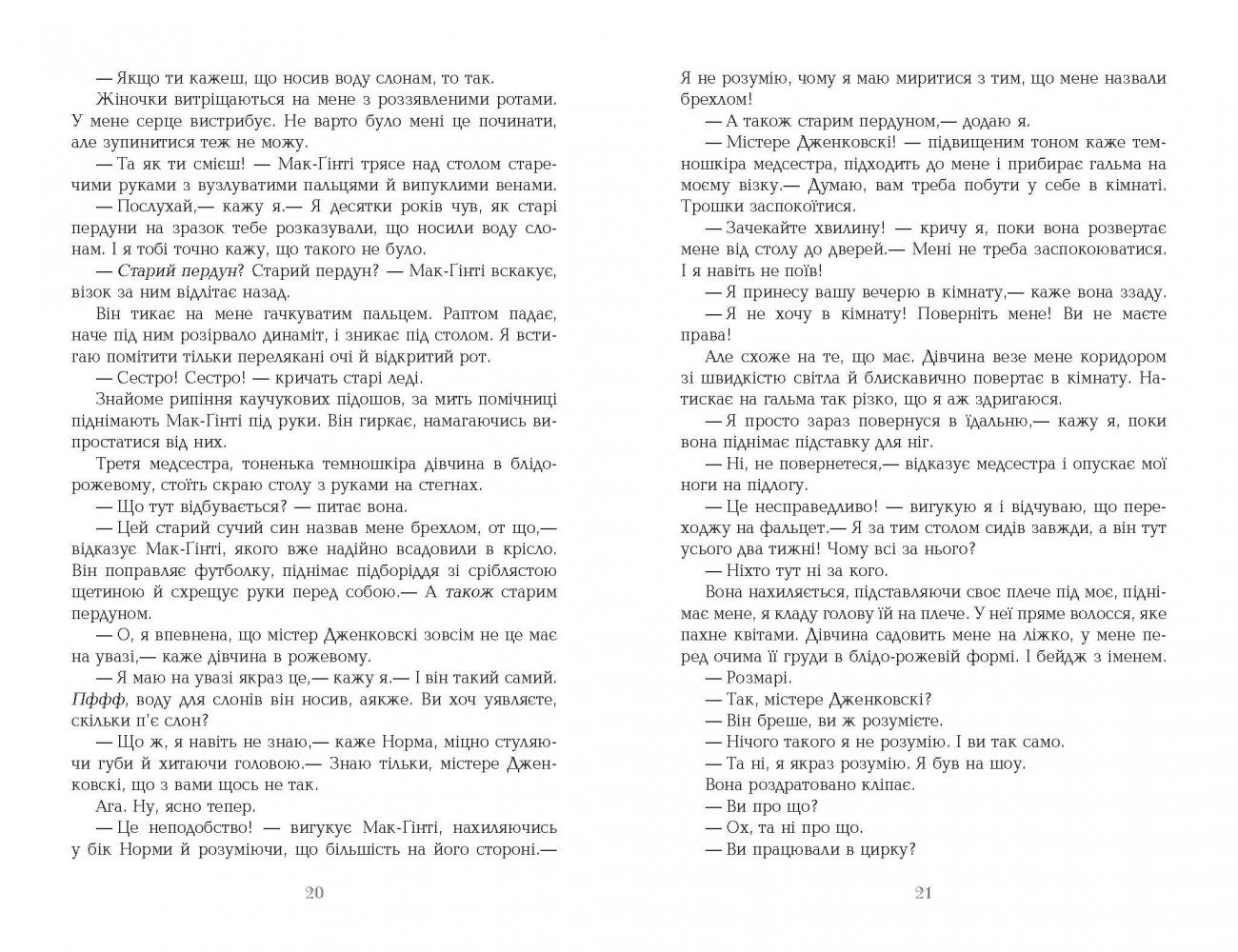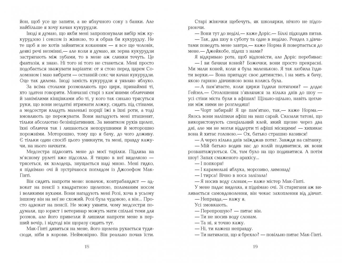 Джейкоб сумлінно відвідував лекції в університеті та готувався до скромної кар’єри доктора ветеринарної медицини. Та в долі були свої плани щодо нього. Втративши все, хлопець у буквальному сенсі вскочив у потяг — як виявилось згодом, цирковий. Саме цирк подарує йому друзів, кохану, професію і навіть слониху! Саме цирк навчить його протистояти злу і нічого не боятися. Через 70 років Джейкоб до найменших дрібниць згадає цю неймовірну мандрівку, ні про що не шкодуючи.