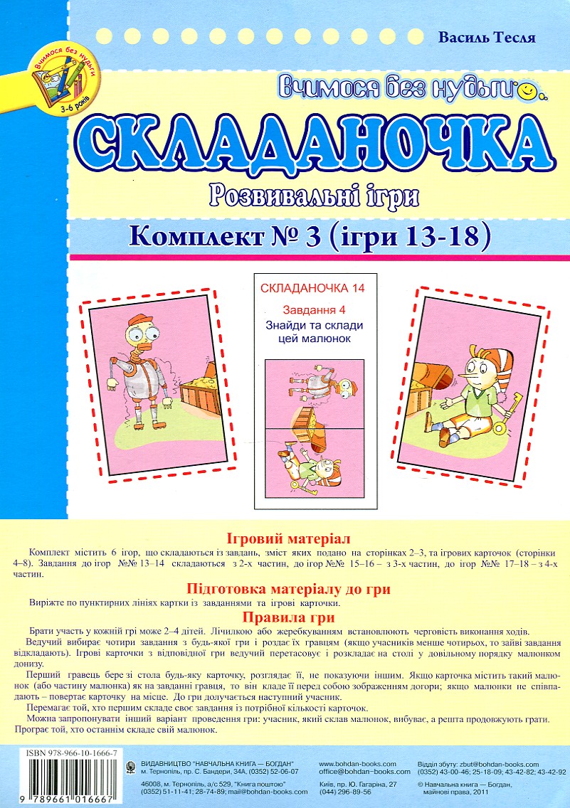 "Комплект містить 6 ігор, що складаються із завдань, зміст яких подано на сторінках 2-3, та ігрових карточок (сторінки 4-8). Завдання до ігор №13-14 складаються з 2-х частин, до ігор №15-16 з 3-х частин, до ігор №17-18 з 4-х частин."