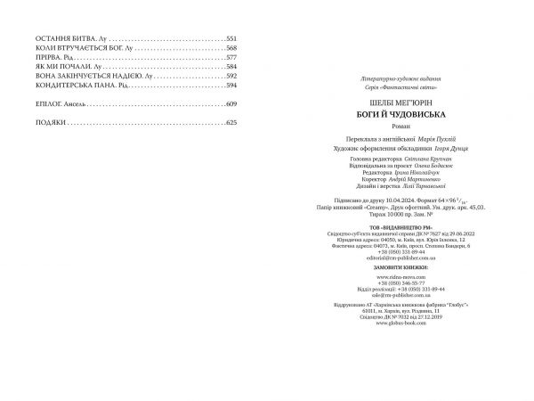 Лу все життя тікала. Тепер, коли Морґані завдано нищівного удару, настав час повернутися додому - і забрати те, що належить їй по праву. От тільки це вже не та Лу, яку знали друзі. Не та Лу, що полонила серце шасера. Нею заволоділа пітьма, і цього разу її доведеться долати не лише любовю. Приголомшлива трилогія Шелбі Мегюрін - Змія і голуб, Кров і мед, а також її фінал, Боги й чудовиська - відкриє вам світ карколомних пригод, магії та кохання. Візуалізація зовнішнього вигляду обкладинки може відрізнятися від вигляду книжки _ більше інформації в Характеристиках Оригінальна назва книжки: Gods Monsters (Serpent Dove, №3)