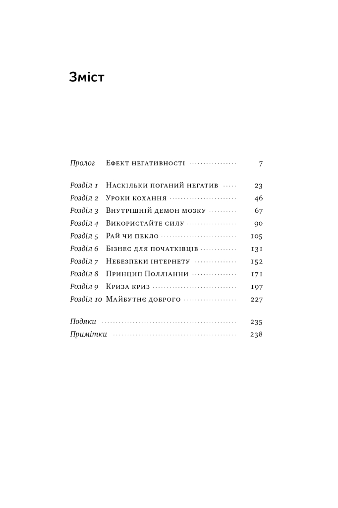 З цієї книжки ви довідаєтеся, як протидіяти негативу та покращити стосунки, кар’єру й життя загалом завдяки перевіреним стратегіям, як-от раціоналізація, принцип Полліанни, правильний спосіб повідомляти погані новини, нагороди проти покарань тощо. Світ стане безпечнішим і привітнішим місцем, якщо поміняти кут зору.