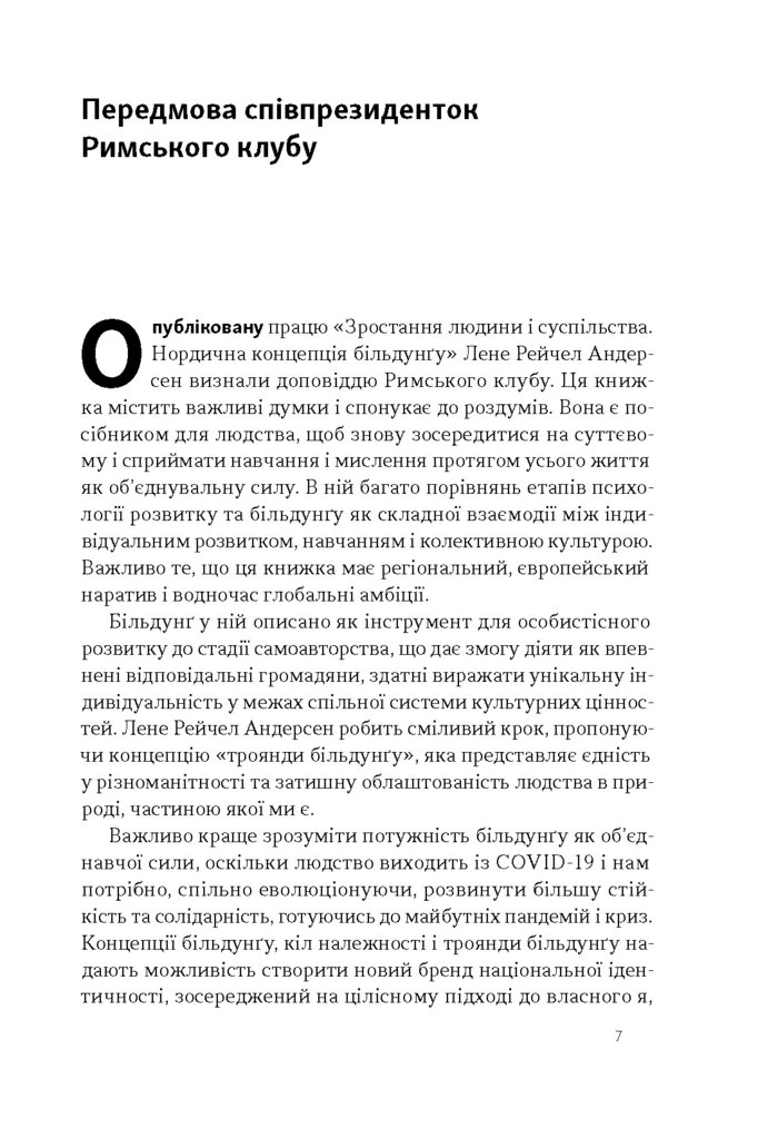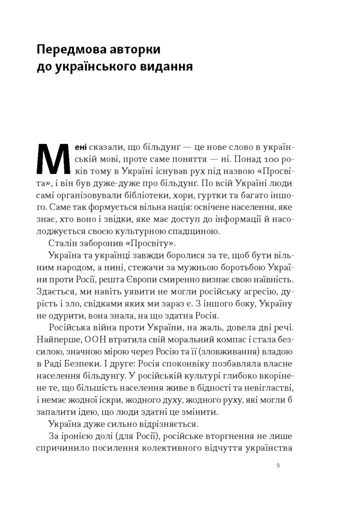 Авторка звертається до понять смислотворення й самоавторства, свободи та відповідальності, важливості не лише теорії, а й практики. Вона показує, як здоровим націоналізмом закласти фундамент демократичної нації. А ще — як з більдунґом для XXI століття можна впоратися з новими викликами, як-от наслідки цифровізації, екологічних проблем, пандемій, міграції, якоюсь мірою — війни