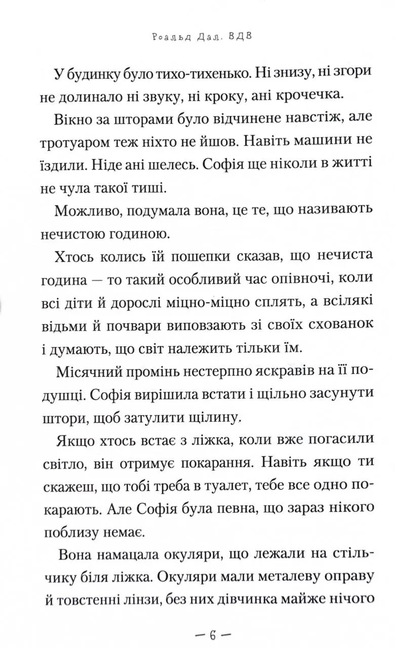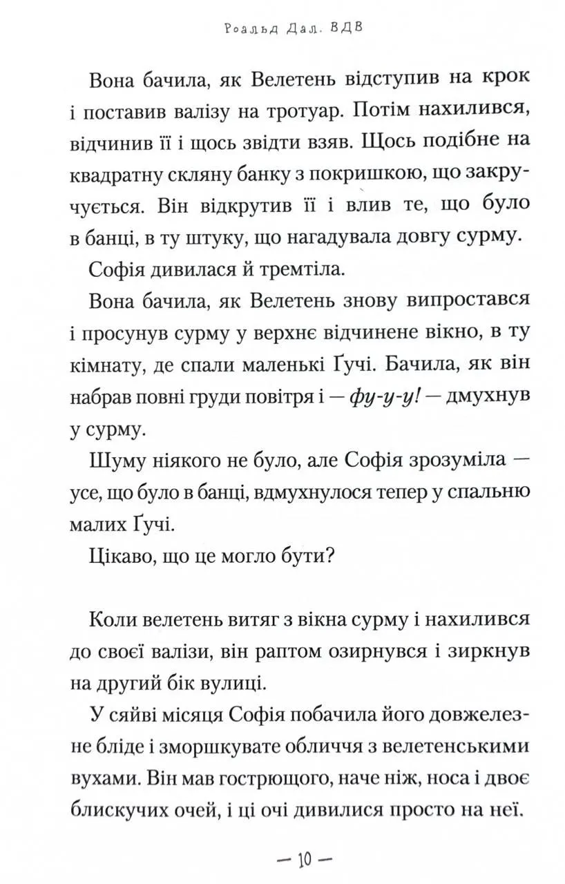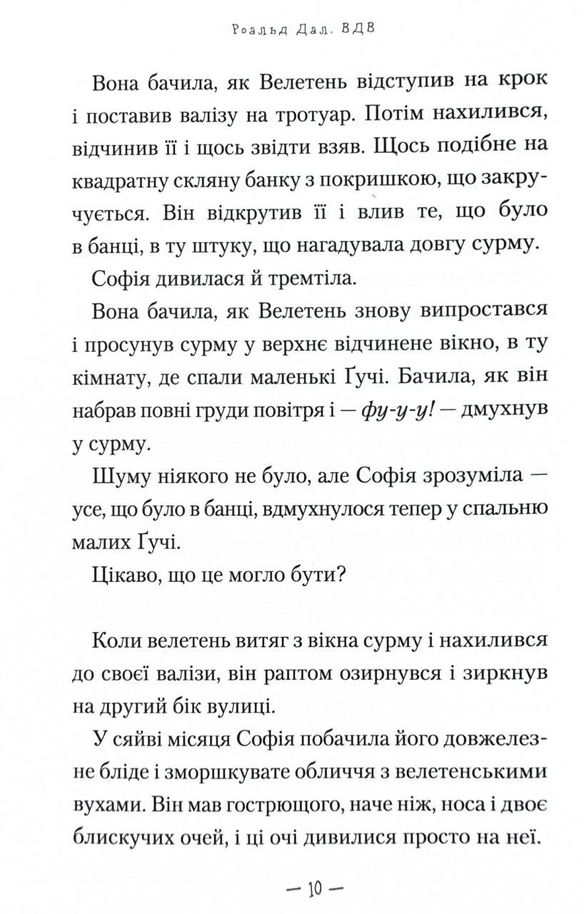 ВДВ (Великий Добрий Велетень) – одна з найвідоміших та найулюбленіших дитячих книг, написана Роальдом Далем. Ця захоплива казкова повість зачаровує серця мільйонів юних читачів по всьому світу. Роальд Даль зумів створити надзвичайно емоційний та сміливий світ, у якому головні герої – велетень-добряк та допитлива дівчинка Софія – вирушають у захопливу мандрівку, щоб врятувати світ від людожерських велетнів.