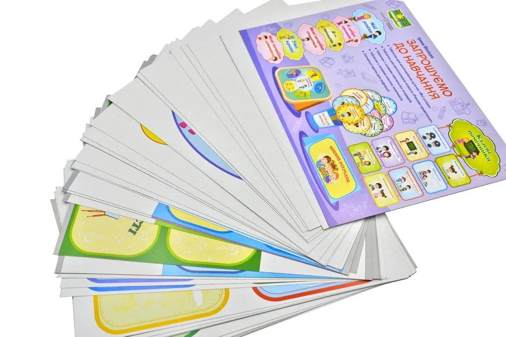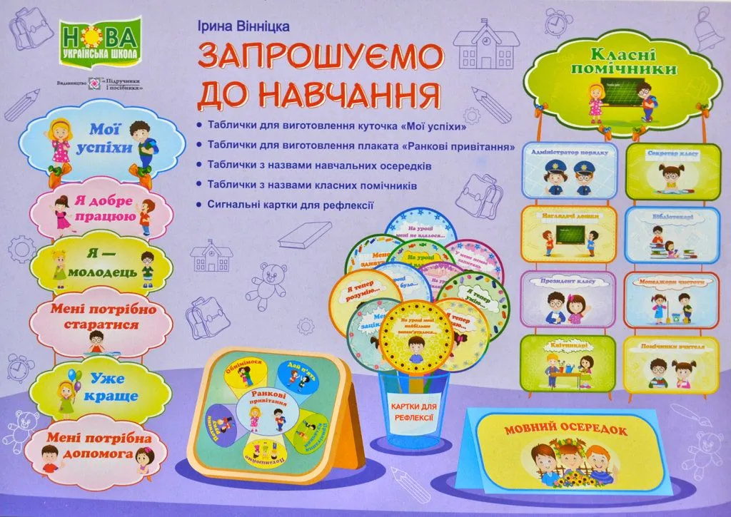 Однією зі складових Нової української школи є створення сучасного освітнього середовища, зокрема багатофункціональних гнучких просторів, що сприяють різним формам роботи, мотивують до навчання.Комплект «Запрошуємо до навчання» буде корисним для вчителів початкових класів, допоможе облаштувати комфортне, яскраве освітнє середовище.До комплекту входять:таблички для виготовлення куточка «Мої успіхи», які рекомендовано вирізати і приклеїти на широку стрічку. Додатково можна приклеїти дитячі фотографії до дерев’яних прищіпок, які учні кріпитимуть до таблички з відповідною оцінкою їхніх успіхів. Оцінювання результатів навчання та особистих досягнень школярів у початкових класах здійснюється вербально, на суб’єктних засадах, що передбачає активне залучення учнів до самоконтролю і самооцінювання. Куточок «Мої успіхи» допоможе сформувати навички самооцінювання;таблички для виготовлення плаката «Ранкові привітання» пропонує різні варіанти привітань: «Обнімімося», «Потисни руку», «Потанцюймо», «Привітання кулачком», «Дай п’ять». Заготовки слід вирізати і приклеїти до цупкої основи по колу. Плакат доречно використовувати під час ранкових привітань. Діти самостійно вибиратимуть спосіб привітання з учителем та однокласниками;таблички з назвами навчальних осередків слід вирізати, скласти за лініями та склеїти. Коротенький вірш допоможе учням запам’ятати назву осередку і які можливості він пропонує;таблички з назвами класних помічників допоможуть учням усвідомити їхню щоденну роль у класі, сформувати соціальні навички, відповідальне ставлення до своїх обов’язків. Рекомендовано вирізати і прикріпити до стрічки. Додатково можна приклеїти дитячі фотографії до дерев’яних прищіпок, які учні кріпитимуть до відповідної таблички;сигнальні картки для рефлексії — це 12 карток, які рекомендовано вирізати і прикріпити до дерев’яних шпажок, а зберігати їх варто у спеціальних склянках. Картки можуть стати атрибутами кожного шкільного дня та незамінними помічниками в роботі вчителя. Їх доцільно використовувати на етапі рефлексії. За такими картками діти навчаються аналізувати, узагальнювати, підсумовувати.