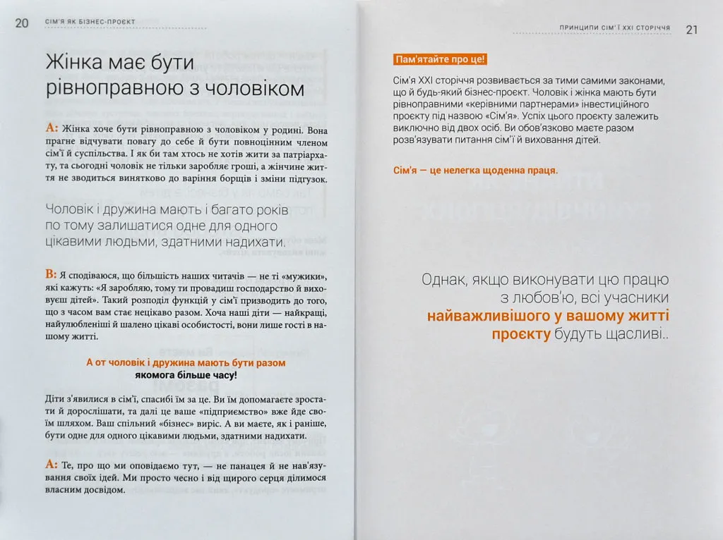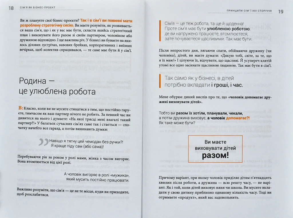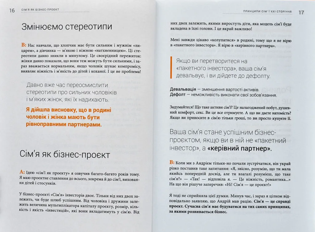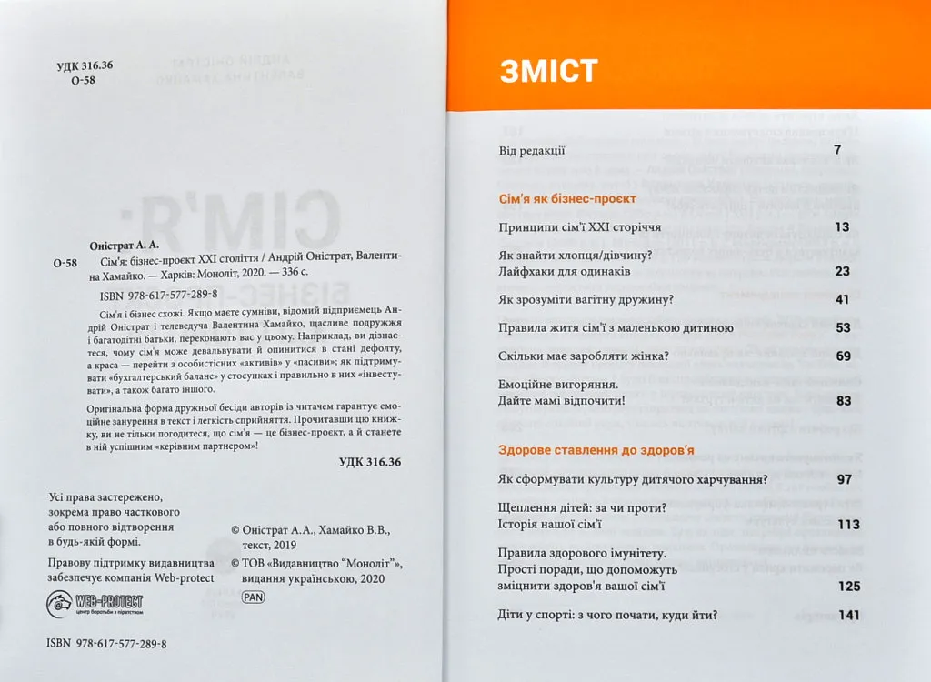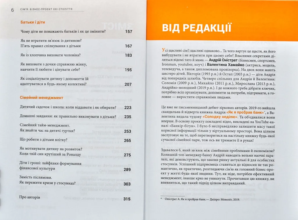 Як не помилитися у виборі партнера, зберегти любов і гармонійно пройти через всі кризи, які неминуче трапляються в житті будь-якої сім'ї? Як виростити дітей здоровими, сформувати у них необхідні для життя в соціумі якості? Як навчити їх розпоряджатися грошима, прищепити відповідальність і забезпечити достатньою «порцією» впевненості в собі? Свої відповіді на ці та багато інших питань пропонують Андрій Оністрат, спортсмен, бізнесмен, автор яскравих мотивуючих книг і передач, і його дружина Валентина Хамайко - екс-модель, телеведуча, чудова господиня і мати чотирьох дітей.