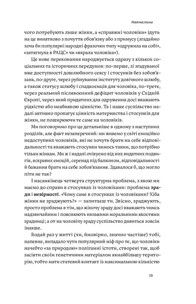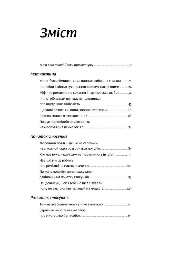 Ця книжка присвячена саме ілюзіям, що перешкоджають побудові приємних і плідних стосунків. Авторка аналізує власний досвід та намагається розібратися, чи щось із накопичених людством знань і мудрості (а надто — немудрості) про жінок, чоловіків та їхні взаємини можна систематизувати, впорядкувати і практично використати для створення «єдинорога» наших часів — здорових стосунків.