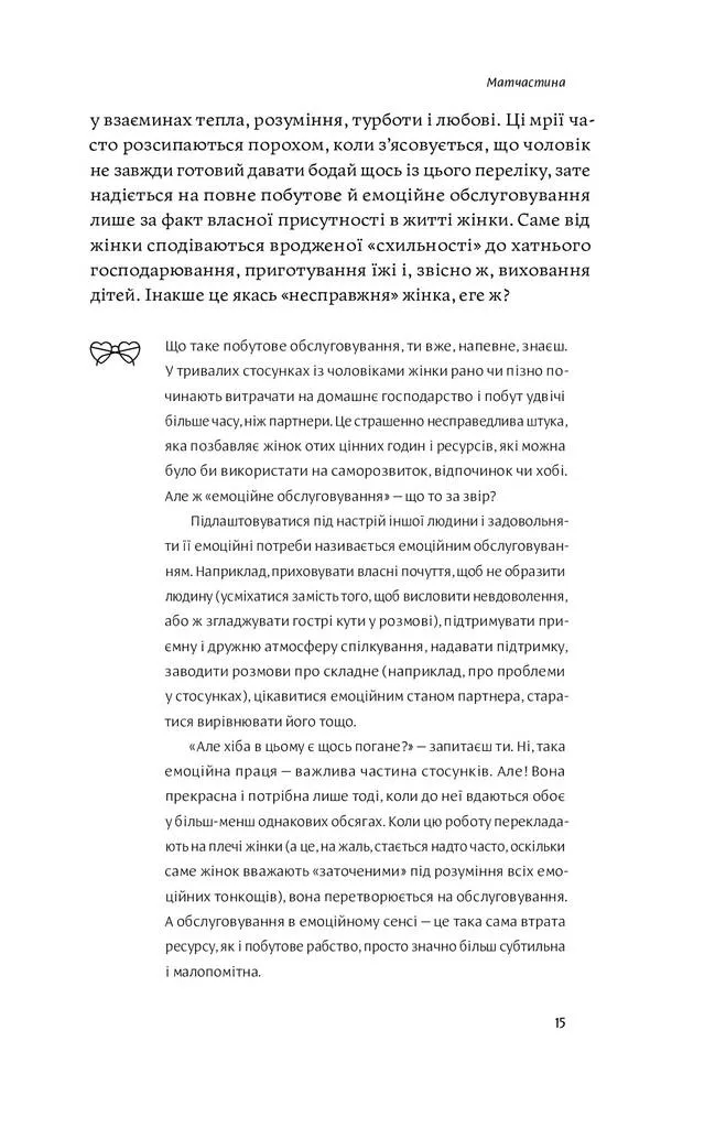 Тривала, серйозна, саркастична, відверта і болісна розмова з собою перетворилася на книжку, яка не дасть усіх відповідей, але допоможе поставити правильні запитання і утвердитися в тому, що ти завжди інтуїтивно розуміла про суспільний і культурний тиск, міф про романтичне кохання, здорові та нездорові стосунки, тривожні маркери на перших етапах знайомства, уміння вчасно піти, буття собою і спроби змінити іншого, баланс і динаміку сил у парі, повагу до власних кордонів, тіло та секс у стосунках і решту речей таких очевидних, що ми схильні про них забувати, відкидаючи всі шанси на своє персональне, крафтове, унікальне «довго і щасливо». А ми його, чорт забирай, варті!
