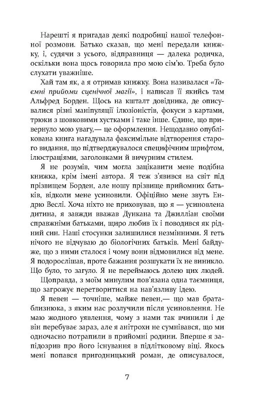 В основі сюжету роману відомого британського письменника — історія протистояння двох талановитих ілюзіоністів початку ХХ століття. Пошук нових ефектних трюків, що перемішався з особистою ворожнечею, поступово переріс у справжню битву технологій, до якої залучили навіть геніального винахідника Ніколу Теслу. Невпинна гонитва призвела до трагедії. Свідками розв’язки стали прямі нащадки ілюзіоністів, що за століття прочитають щоденники магів. Захопливі описи трюків, гострота емоцій персонажів, фірмовий «холодок» високо оцінять прихильники жанру містичного трилера.