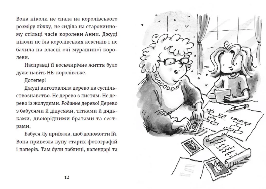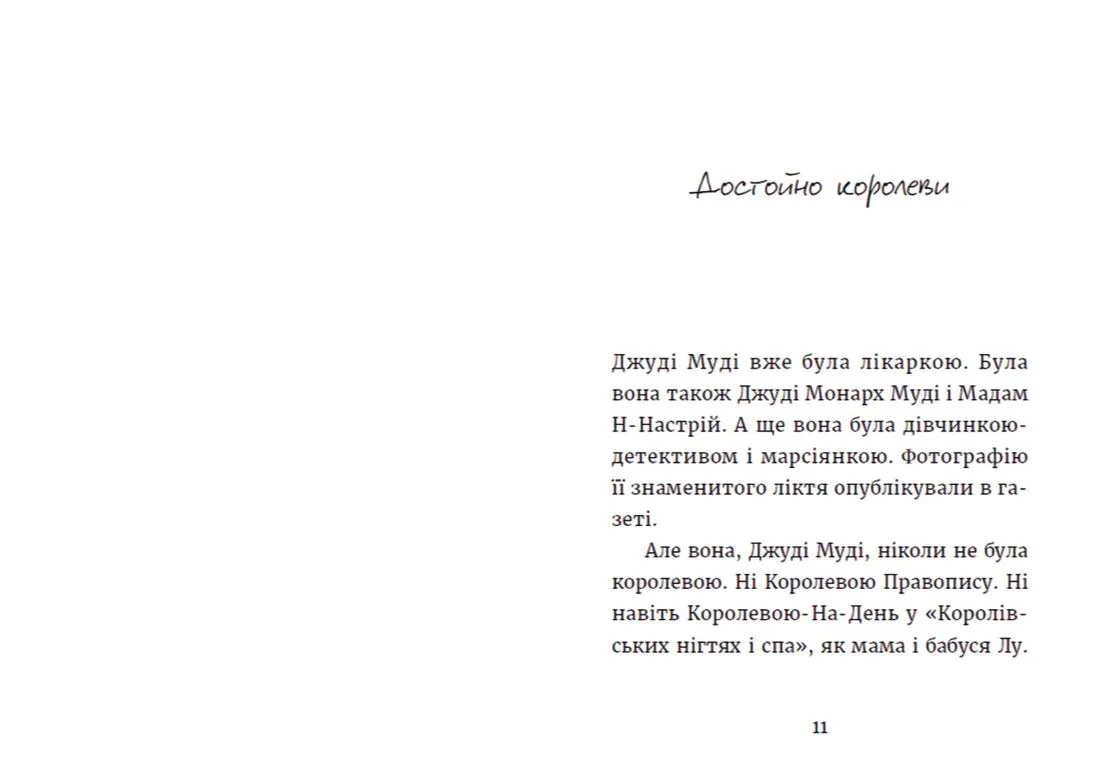 У Джуді Муді фіолетово-королівський настрій! Виявляється, колись Муді (тобто їхні сміливі предки) жили в Англії. Тож, якщо вірити нотаткам її дідуся, Джуді навіть може бути родичкою — королівські фанфари, будь ласка, — самої королеви! Може, вже час пакувати її фіолетовий халат для ночівлі у Букінгемському палаці? Але от халепа, а якщо її прадідусь у тринадцятому коліні не був королівської крові?.. Тепер Джуді має справжню королівську таємницю, яку воліє сховати десь у підземеллі, особливо від Джесіки Фінч-Зрадинч!