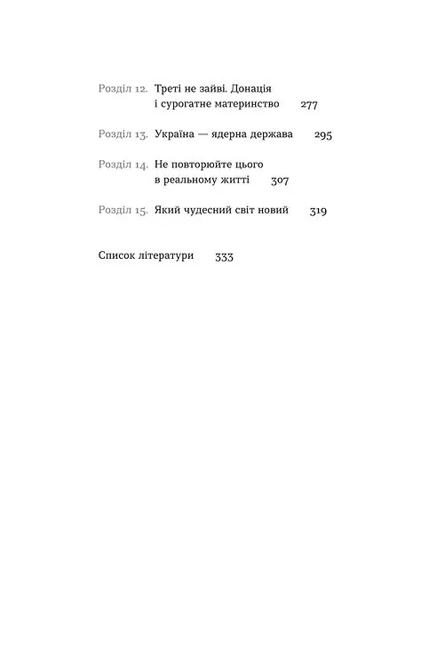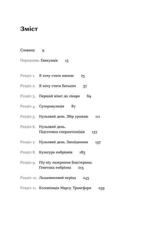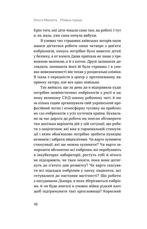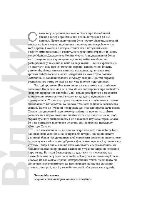 Тут не буде закликів на кшталт «плодіться і розмножуйтеся». У книжці ембріологині Ольги Малюти ви знайдете лише багато прекрасної біології процесу зародження нового життя. Як відбувається штучне запліднення та звідки в аптеках беруться гормони? Як Ватикан заробляв на лікуванні безпліддя? І чому в драконихи й віслючка зі «Шрека» не може бути дітей? Та найважливіше: що насправді коїться за дверима лабораторії, де відбувається штучне запліднення й до чого варто готуватися людям, які вирішать здолати цей шлях?