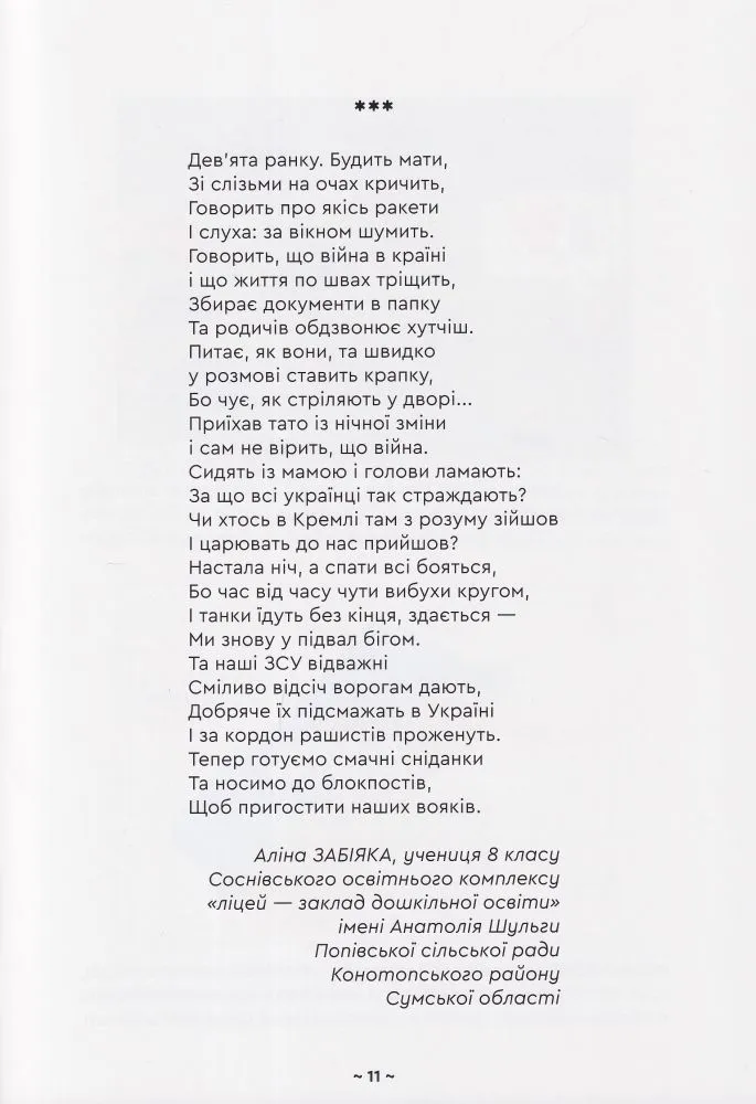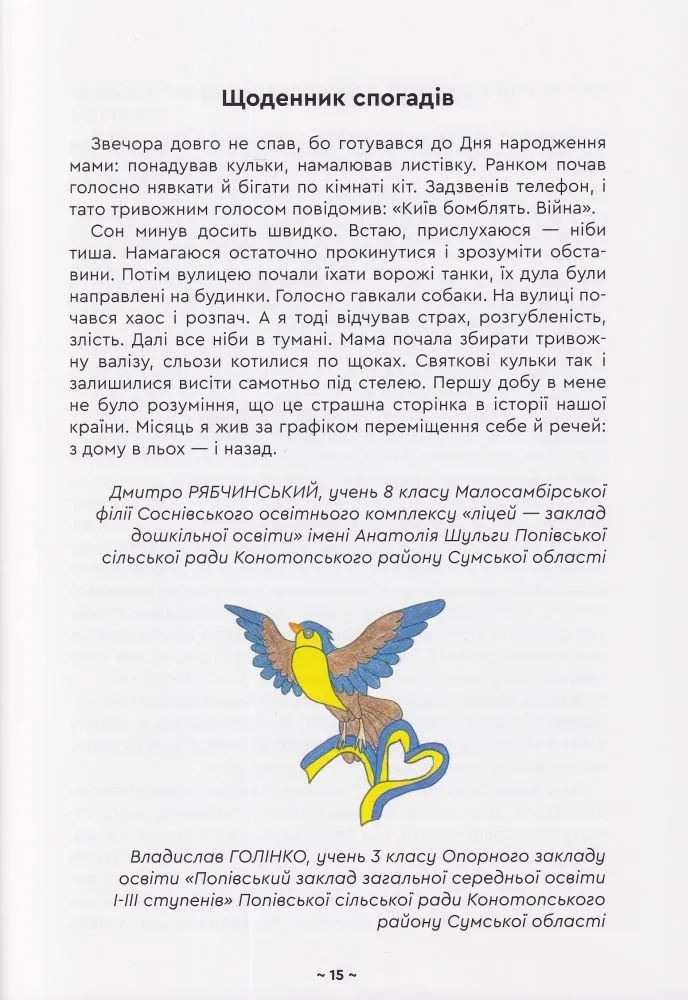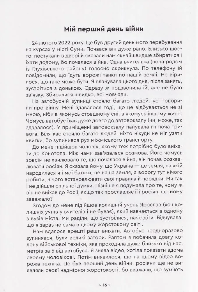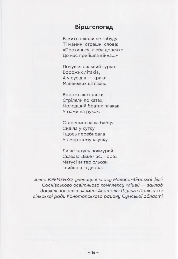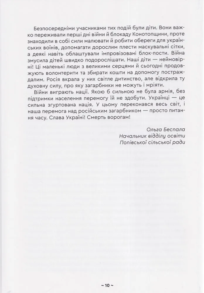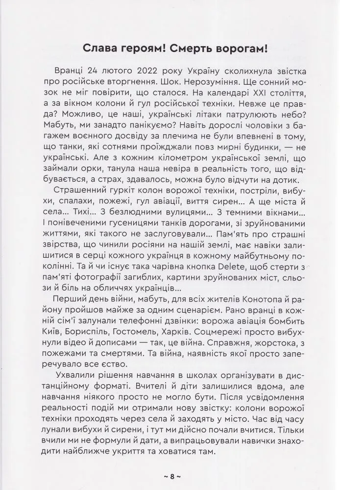 24 лютого 2022 року цього дня життя українців змінилося назавжди. Страх, біль, розпач — ці емоції стали постійними супутниками людей від початку повномасштабної війни. Знищені домівки та мрії, нахабно вкрадені життя — хто б міг подумати, що нашим дітям доведеться побачити весь жах війни.Але є те, що підлі росіяни ніколи не зможуть вкрасти чи знищити — незламність та непохитну віру в нашу перемогу!Ця книга історія війни очима дітей і вчителів Попівської громади Конотопського району. В прозі, поезії і малюнках, на кожній сторінці відчувається стійкість і надзвичайна сила духу.