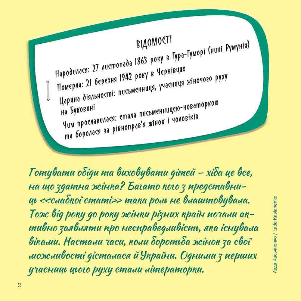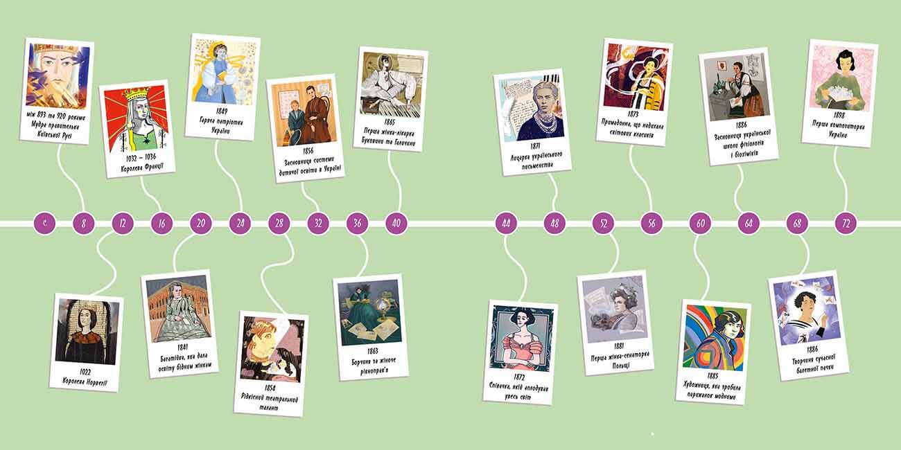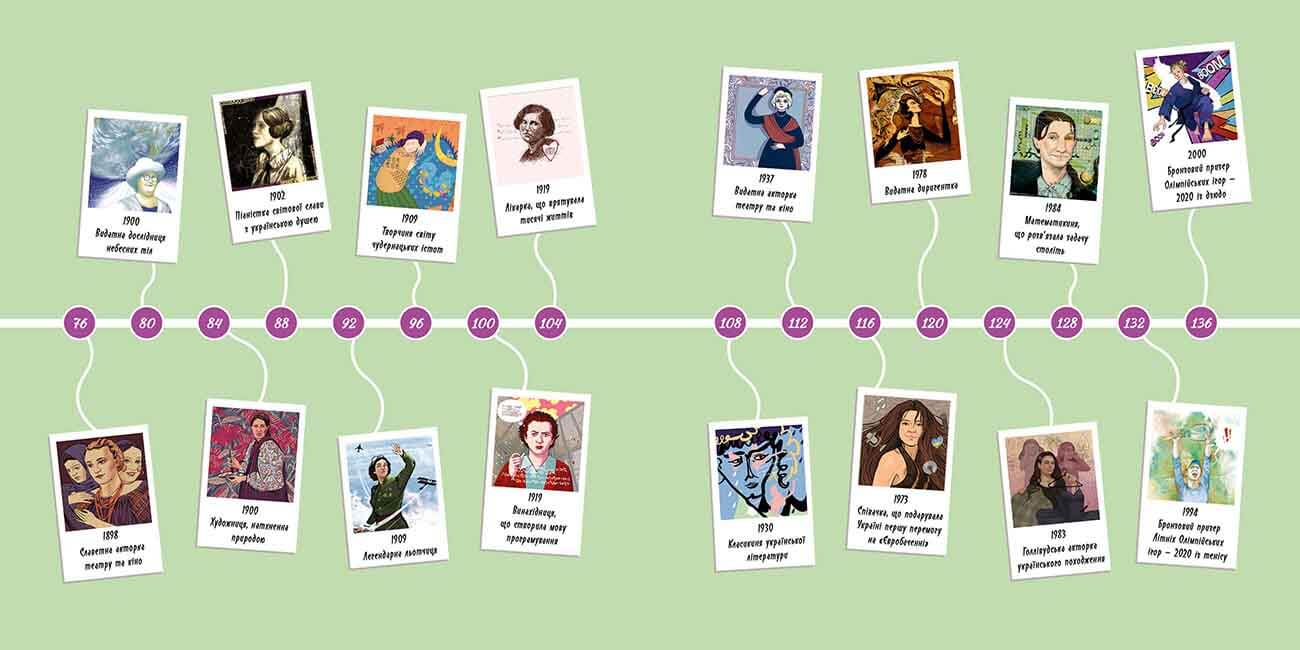 На вас чекають історії 33 жінок, які зробили у своєму житті так багато важливого, що увійшли в історію. Вони не були схожі одна на одну, займалися різними справами та жили в різний час. Але все-таки мали чимало спільного: були сповнені неймовірної сили духу, визначного таланту й натхнення, дуже наполегливо працювали та не боялися ризикувати. Водночас були не просто мрійницями, а вперто просували свої думки та боролися за втілення власних ідей. Їм удавалося ламати безліч стереотипів, обстоювати нові права, рухати вперед науку та мистецтво, підкорювати небо, дивувати світ красою та навіть рятувати життя. А ще всі героїні народилися в Україні, а об’єднує їх любов до рідного краю.