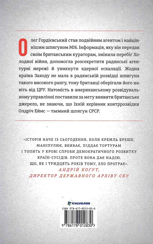 Олег Гордієвський став подвійним агентом і найціннішим шпигуном МІ6. Інформація, яку він передав своїм британським кураторам, змінила перебіг Холодної війни, допомогла розсекретити радянські агентурні мережі й уникнути ядерної ескалації.