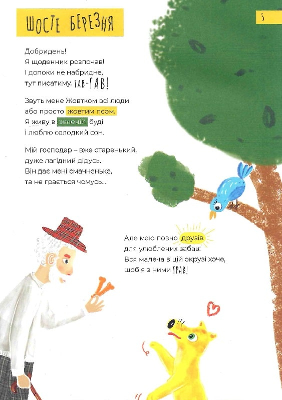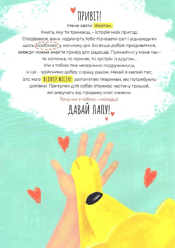 Його звати Жовток, і він – наймиліший у світі пес. Пухнастий, м’якенький, кумедний і жовтий, немов сонечко.У Жовтка нюх на смаколики, а ще – на хороших людей. Тому куди б він не встряг своїм довгим носиком, з усіх ситуацій вибереться у чудовому гуморі, а якщо пощастить – то ще й зі смаколиком.
