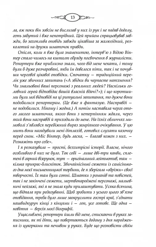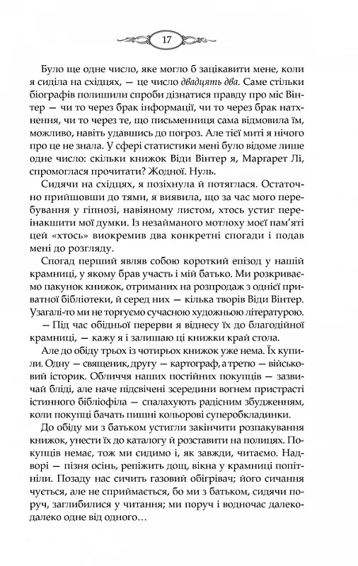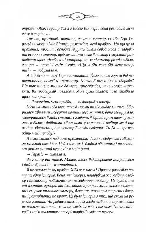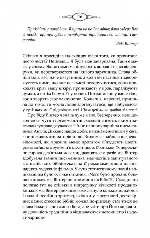 БЕСТСЕЛЕР №1 ЗА ВЕРСІЄЮ THE NEW YORK TIMES• Серія художньої літератури «КУЛЬТREAD»• В екранізації роману, яка вийшла в 2013 році головні ролі виконали - Ванесса Редгрейв, Олівія Колман, Софі Тернер, Стівен Маккінтош та інші.Минуле Віди Вінтер, відомої письменниці, довгі роки залишалося загадкою для читачів і журналістів: численні версії своєї біографії вона легко і переконливо вигадує сама. Проте поважний вік і хвороба спонукають її нарешті розповісти правду. Записати свою справжню історію Віда пропонує Маргарет Лі. Чому вибір Віди впав саме на цю аматорку в жанрі біографії, у житті якої до того ж немає нічого незвичайного, крім однієї деталі?..Тим не менш Маргарет приїздить у старовинний маєток Вінтер, де за кожними дверима прихована таємниця. Вона з головою поринає у чужі сімейні секрети. Але хто знає, чи не зустріне вона в коридорах старого будинку свого власного привида?