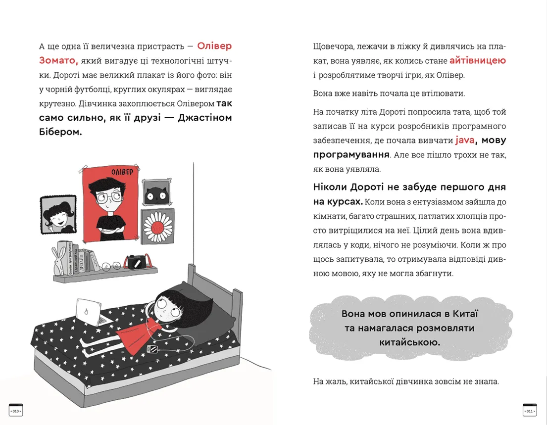 Дванадцятирічна Дороті захоплюється комп’ютерами, 3D-принтерами, дронами й подібними технологічними штучками. У майбутньому дівчинка планує стати айтівницею. Саме в її містечку Пало-Альто відомий на весь світ розробник Олівер Зомато ось-ось представить найбільш очікувану фанатами комп’ютерну гру. Дороті мріє побувати на презентації — але батьки її не підтримують. Засмучена Дороті йде на прогулянку, на якій знаходить дивні окуляри — і разом зі своїм маленьким песиком Тоспіком потрапляє у дивовижну пригоду. Герої казкової історії — Опудало, Робот-Тесля, страшний Лев та інші — допоможуть дітям зрозуміти, що таке алгоритми, умови, цикли, у чому суть бінарного методу й техніки п’яти «чому». Книжка зацікавить дітей, що планують опанувати основи програмування.