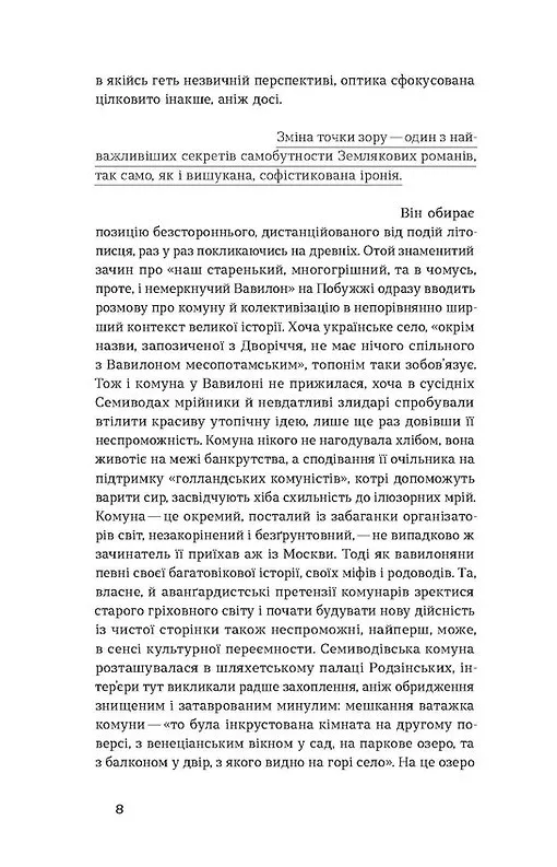 Василь Земляк пише про знайомі, на перший погляд, реалії: українське село 1920—1940-х, революція, руйнування шляхетських садиб, перші комуни, колгоспи, Друга світова. Однак усе подано в якійсь геть незвичній перспективі.