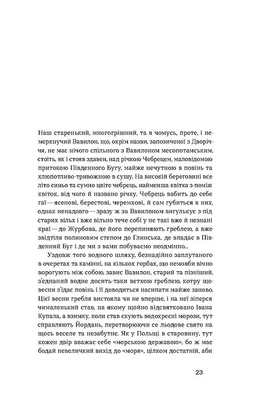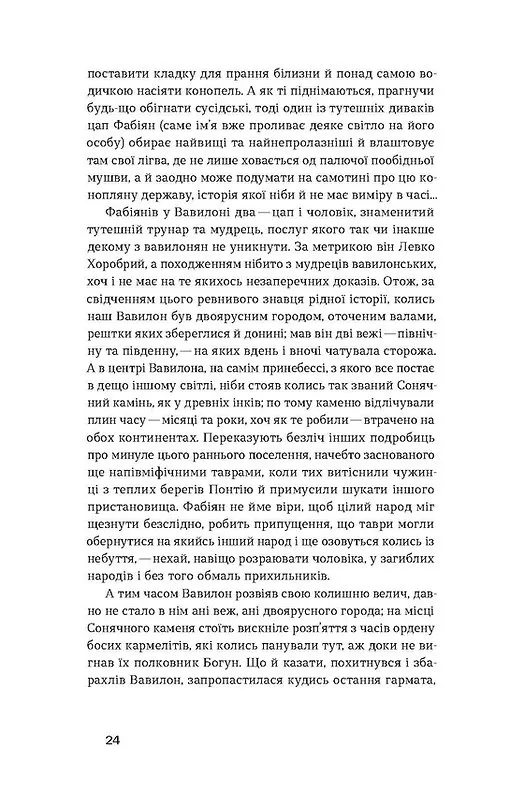 Старенький Вавилон на Побужжі, селяни, які викопують під грушею колекцію старовинної зброї, місцевий філософ, який читає Платона й розповідає про таврів і скіфів, гойдалка, побудована агентом з продажу швейних машинок «Зінґер», щоб видати доньок заміж, цап Фабіян, що стає задом до розстрільної бригади — все це сплітається у химерний роман на тлі чорторию великої історії.