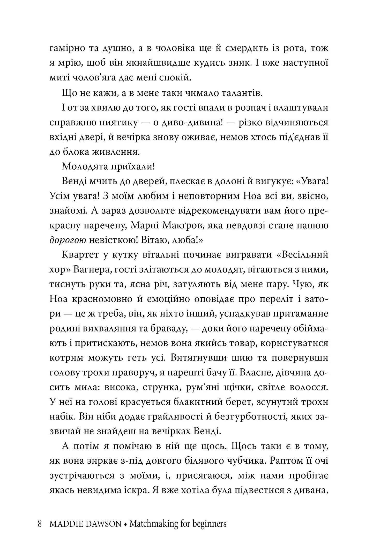 Марні Макґров хотіла б звичайного життя: чоловіка, дітей і заміський будинок. Вона готується до весілля з красивим хлопцем і впевнена, що нарешті всі її мрії здійсняться. Проте Блікс Голлідей, дивакувата двоюрідна бабця нареченого, природжена сваха, каже, що невдовзі все зміниться й на Марні чекає інше, яскраве й насичене, майбутнє. Зрештою, стається саме так, як пророкувала Блікс.