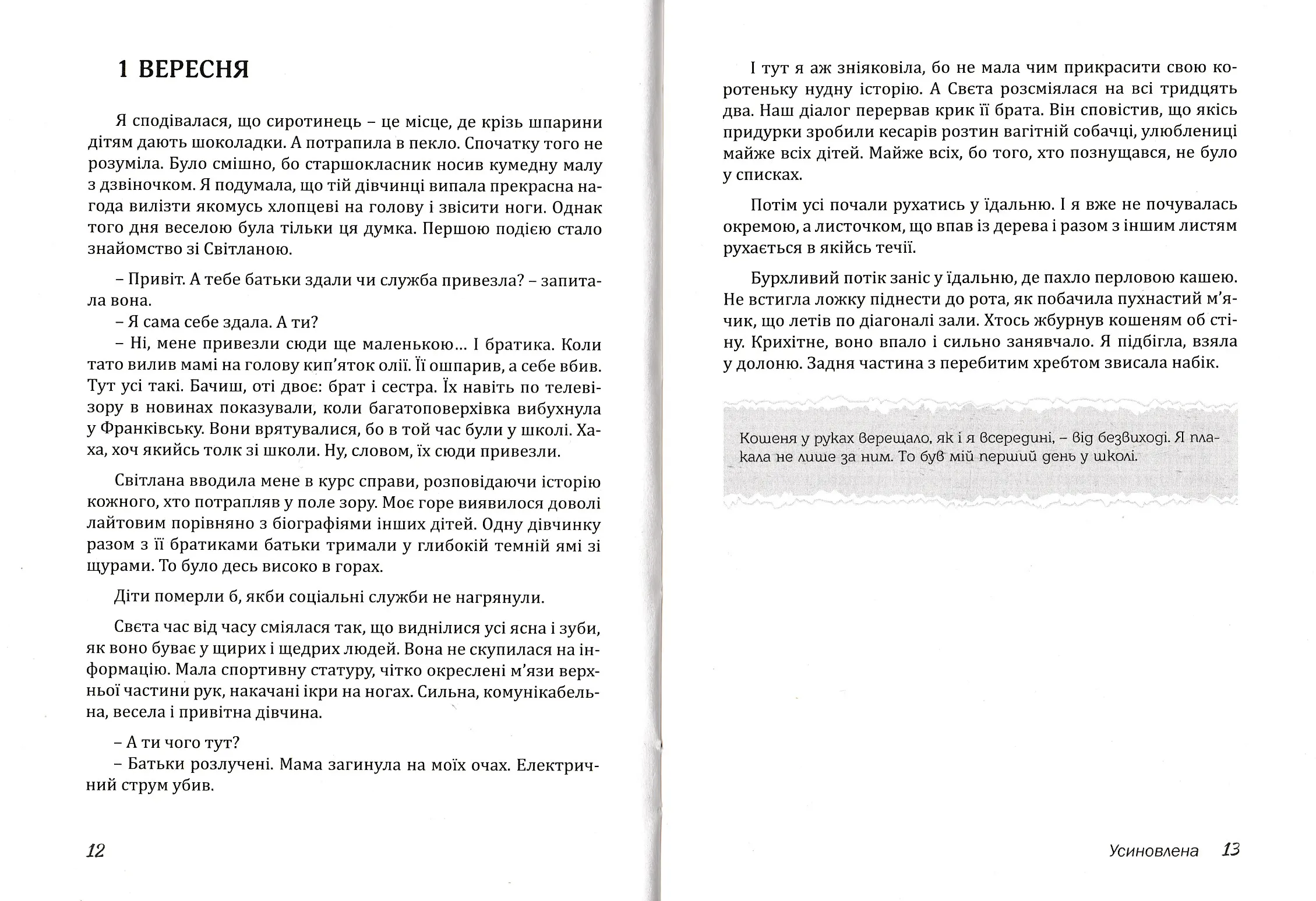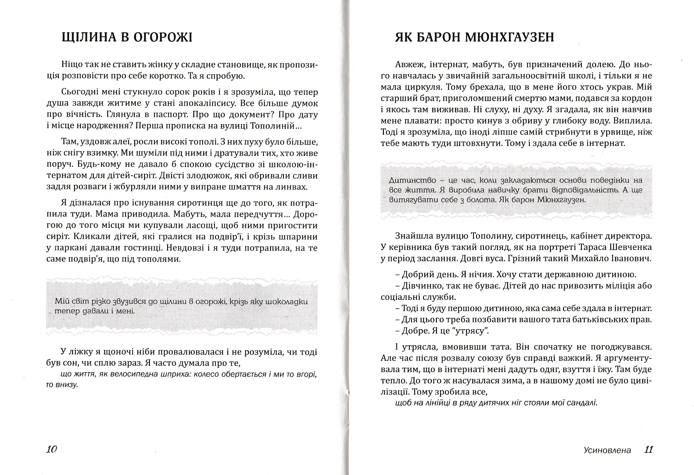 "Усиновлена" - це зібрання коротких мотиваційних оповідань, апробованих у соціальних мережах у вигляді популярних дописів.Вони ніби постали на межі літератури і психології. Авторка спонукає читача розмірковувати в атмосфері свободи і мудрості, віри і духовної радості. Адже цей шлях пізнання і є щастям.