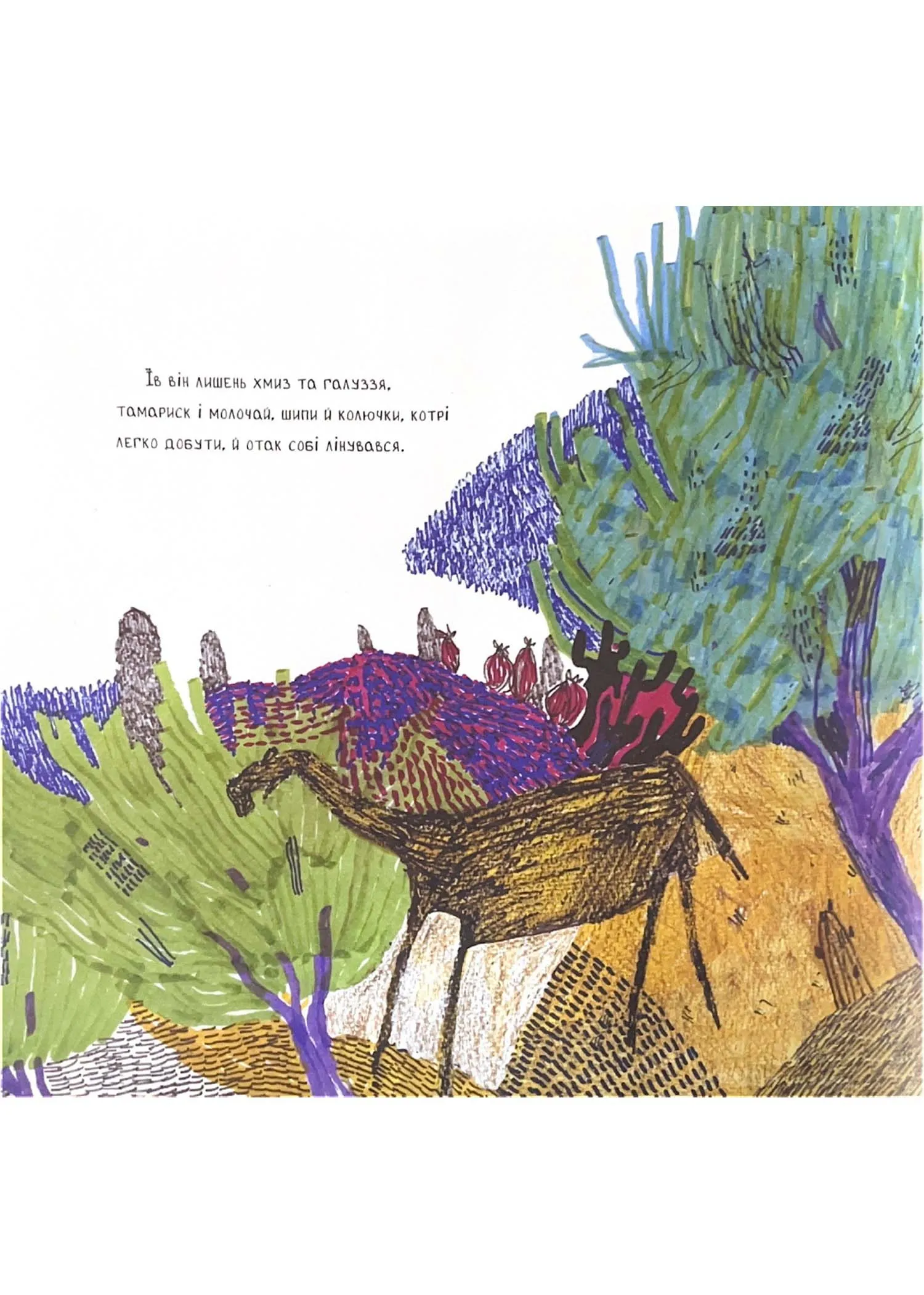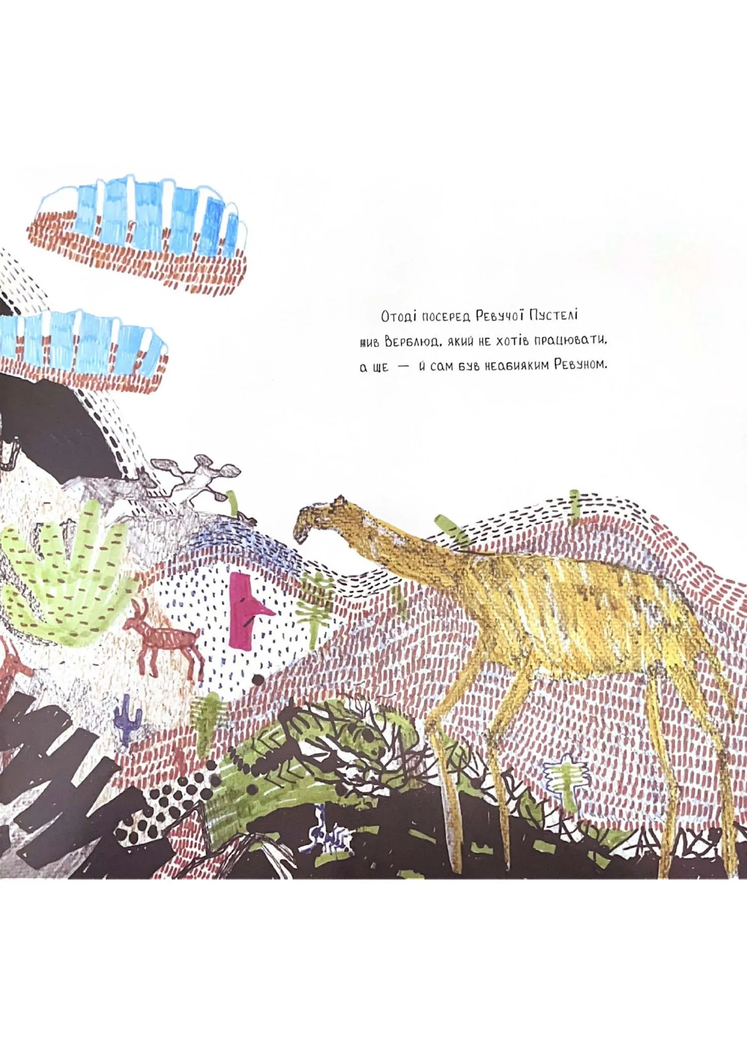 На початку часів, коли світ ще був новий-новесенький, Звірі почали працювати для Людини. Кінь возив, Собака служив, Віл орав, а Верблюд… О, цей пустельний Ревун тільки гирбфкав на всіх і нічогісінько не хотів робити. Та невдовзі лінькуватий Верблюд на власній спині відчув, як важко надолужити згаяний час. Сюжет відомої казки Редьярда Кіплінга про лінькуватого Верблюда в цій книжці набуває нових вигадливих форм завдяки ілюстраціям екохудожниці Тетяни Белащук — простим і щирим, як дитячі малюнки, і водночас загадковим та символічним, як наскельний живопис.