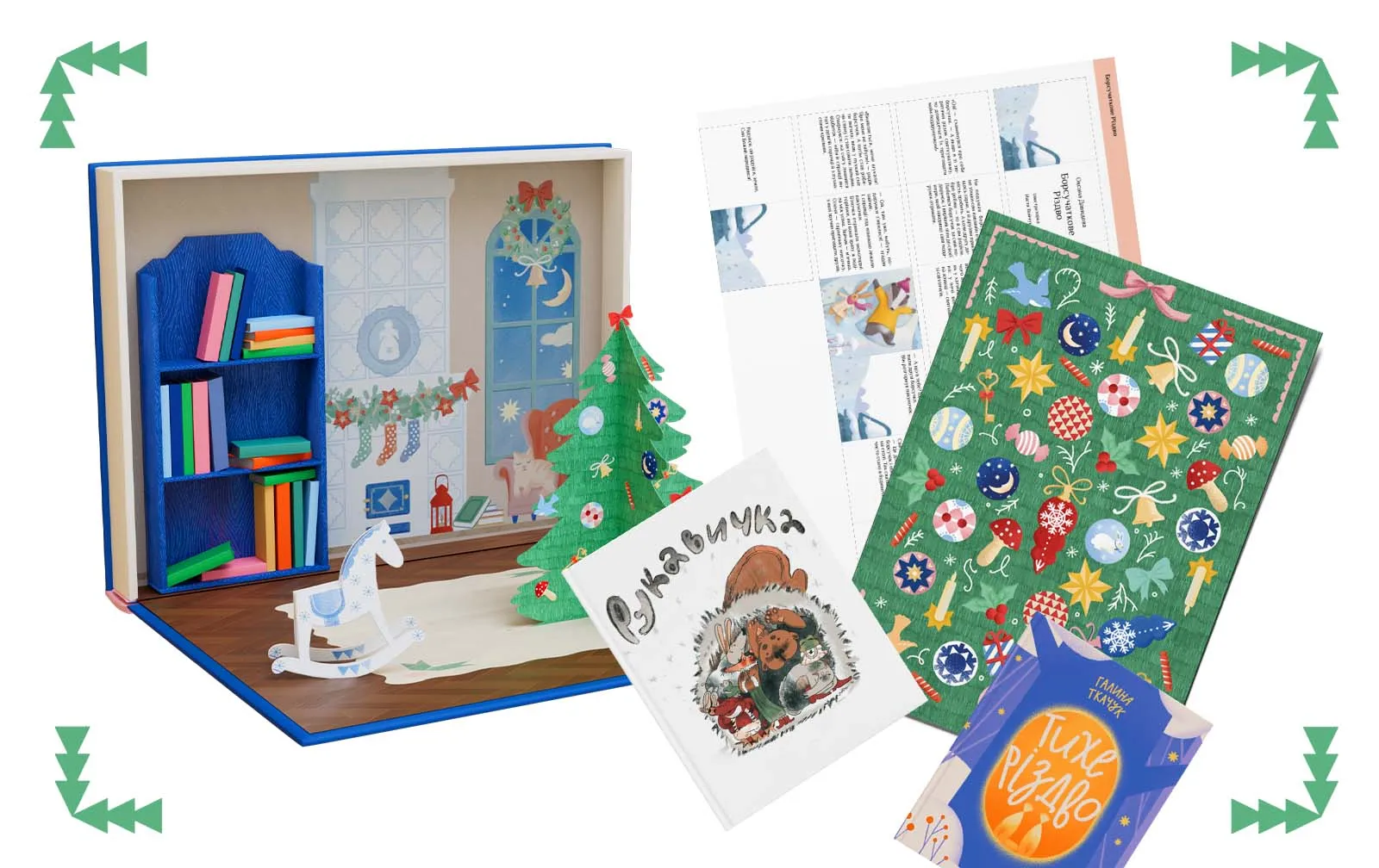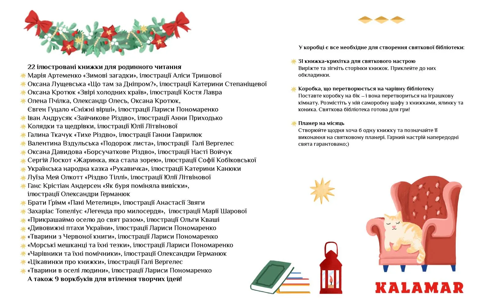 Серед історій, що увійшли до «Моєї святкової бібліотеки», казки українських і зарубіжних авторів, зимові загадки, колядки та щедрівки, пізнавальні книжки та воркбуки, що допоможуть створити гарний настрій в очікуванні дива.