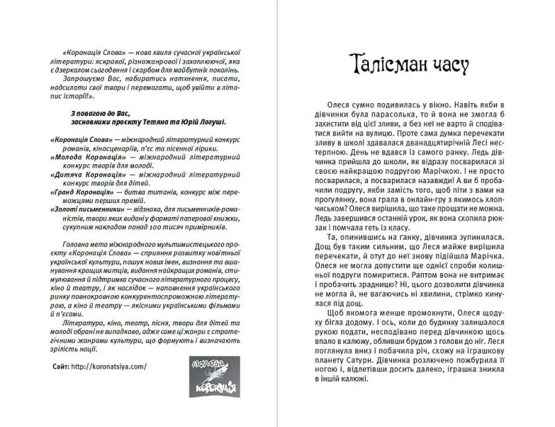 Також до книги увійшло оповідання «Талісман часу» — переможець Міжнародного літературного конкурсу від «Коронація слова» — «Молода КороНація».