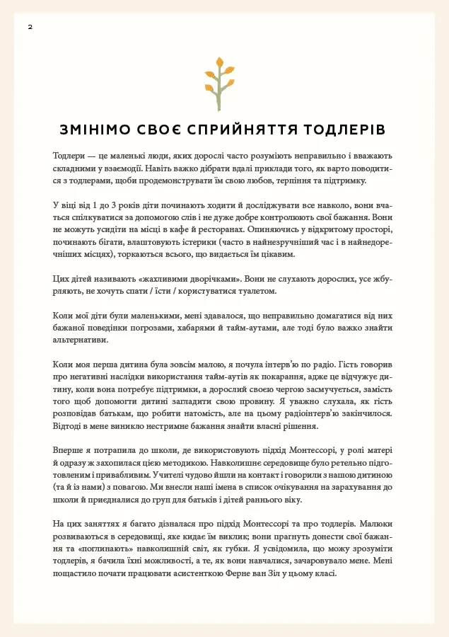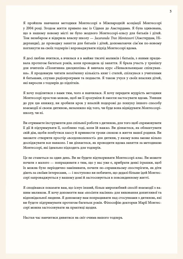 У цій книзі ви знайдете все, що необхідно знати батькам про виховання за системою Марії Монтессорі. Авторка — педагог й засновниця школи Монтессорі — розповідає, як мамам і таткам зберігати спокій у будь-якій ситуації, як розвивати в малюку віком від 1 до 3 років допитливість і які заняття будуть цікаві й корисні для нього. Теорію доповнюють чудові ілюстрації та історії Монтессорі-родин із різних куточків світу.
