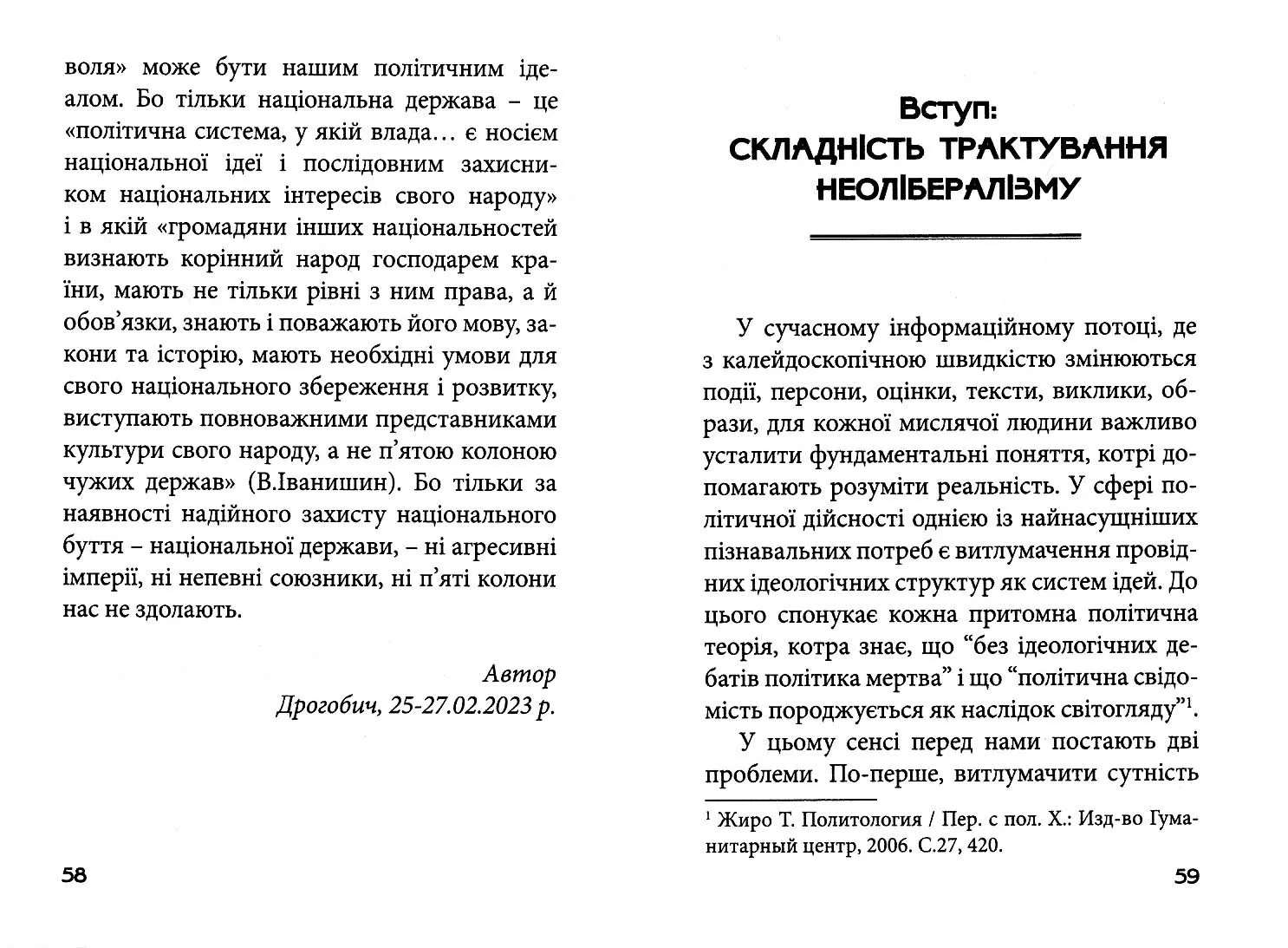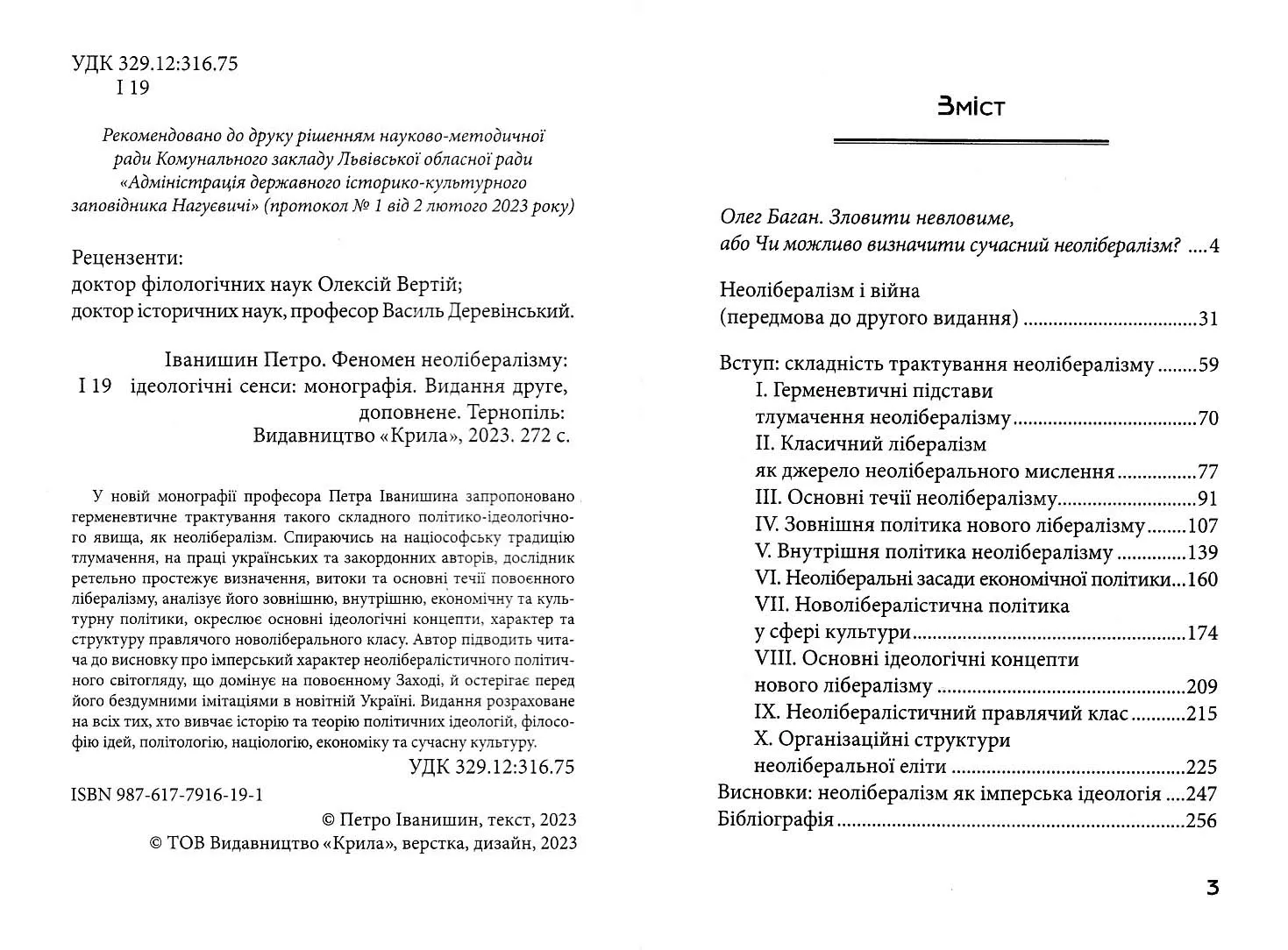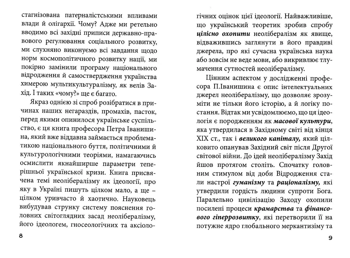 У новій монографії професора Петра Іванишина запропоновано герменевтичне трактування такого складного політико-ідеологічного явища, як неолібералізм. Спираючись на націософську традицію тлумачення, на праці українських та закордонних авторів, дослідник ретельно простежує визначення, витоки та основні течії повоєнного лібералізму, аналізує його зовнішню, внутрішню, економічну та культурну політики, окреслює основні ідеологічні концепти, характер та структуру правлячого новоліберального класу. Автор підводить читача до висновку про імперський характер неолібералістичного політичного світогляду, що домінує на повоєнному Заході, й остерігає перед його бездумними імітаціями в новітній Україні. Видання розраховане на всіх тих, хто вивчає історію та теорію політичних ідеологій, філософію ідей, політологію, націологію, економіку та сучасну культуру.