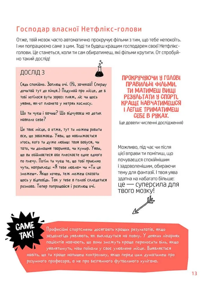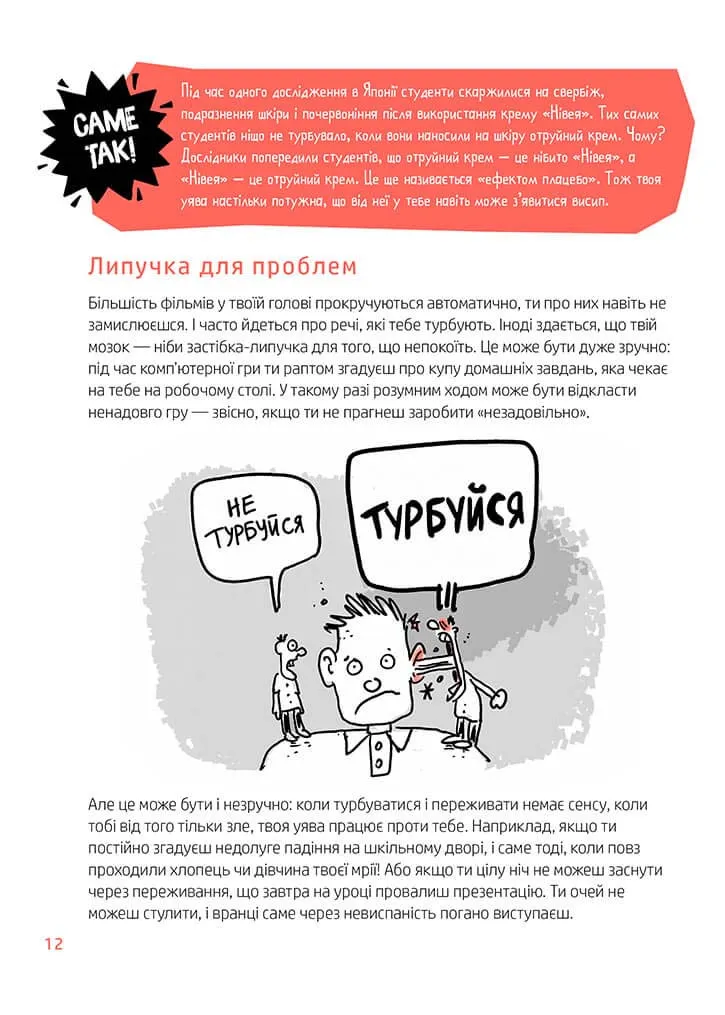 Якщо твоє життя — це комп’ютерна гра, то голова — її контрóлер. І так само, як у комп’ютерній грі, у справжньому житті теж є складні рівні: нарікання батьків, сварка з хорошим другом, перший день у середній школі, думка, що ти невдаха, чи зізнання комусь, що ти її або його кохаєш. Але хай яким складним буде рівень у твоєму житті, якщо користуватися контролером правильно, ти впораєшся з усім!