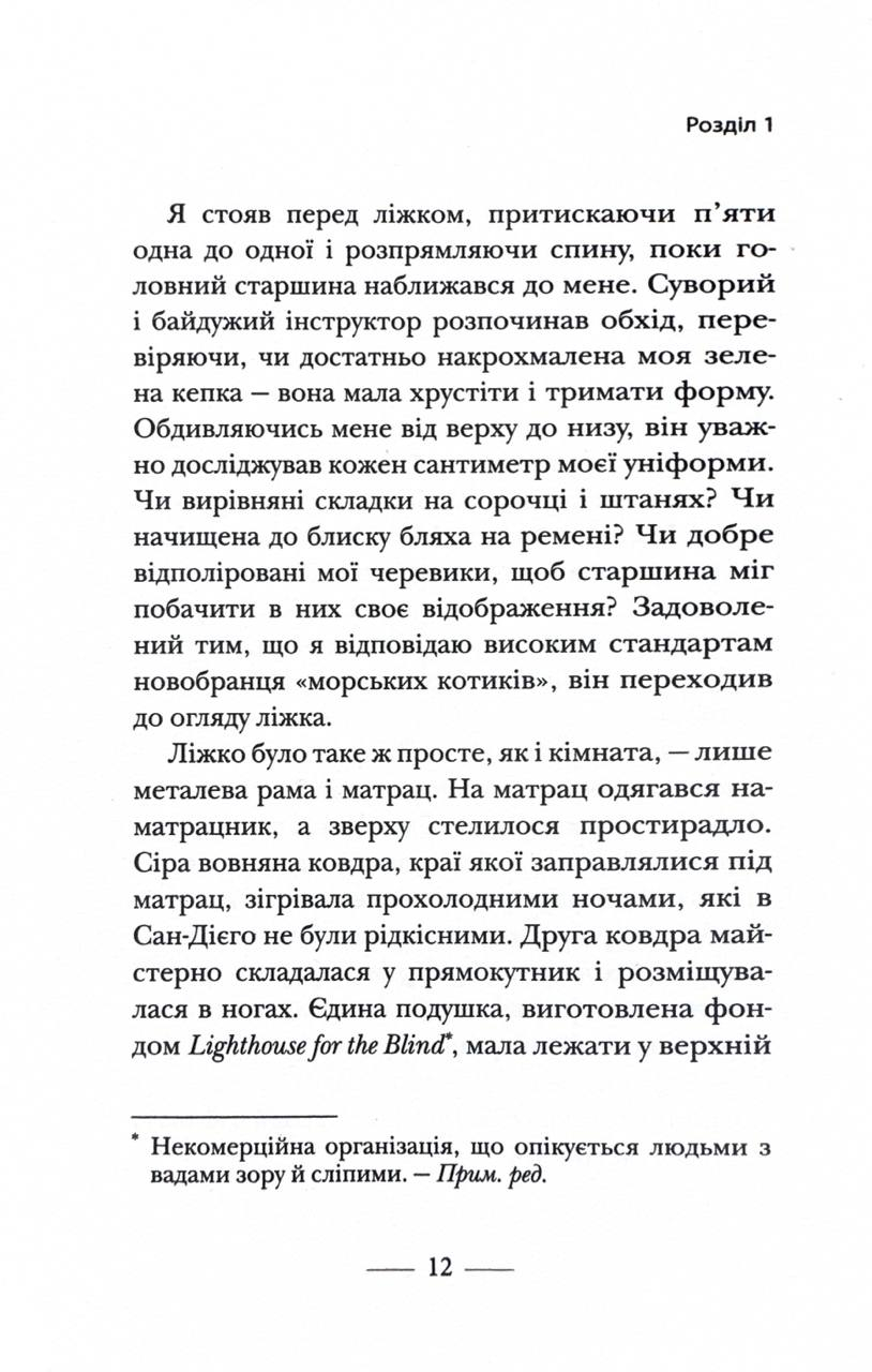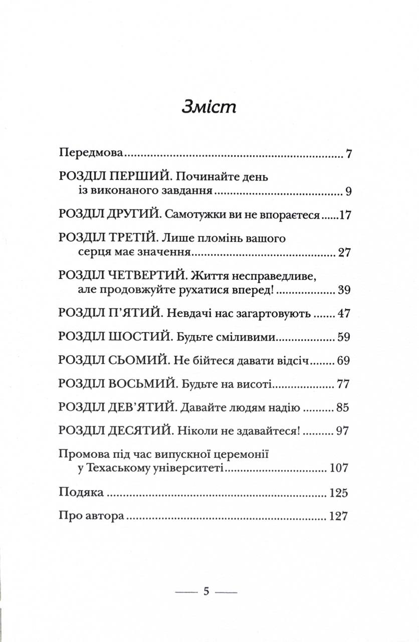 У цьому виданні Вільям Г. Макрейвен, командувач Військово-морських сил США у відставці, визначив десять правил, яких він особисто завжди намагався дотримуватися і які допомогли йому з честю подолати чимало життєвих негараздів. Оригінально сформульовані правила на кшталт "не боятися акул", "не вдаряти передчасно у дзвін", "щоранку застеляти ліжко" мають глибокий підтекст. Автор розкриває суть кожного правила, розповідає цікаві історії про людей, які свого часу надихали його власною дисципліною, наполегливістю, благородством і мужністю.