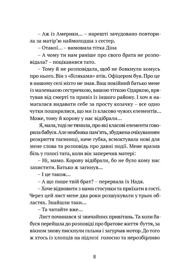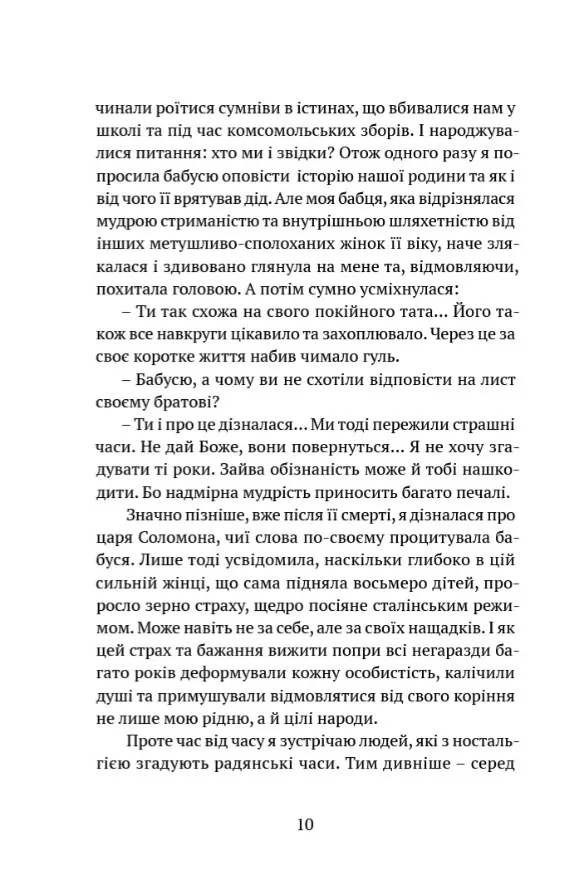 Втрата коріння – трагедія кількох поколінь українців. На жаль, це відбувалося не лише з тими, хто був віднесений вітрами долі за межі України. І на рідній землі зросійщення та спотворення історії перетворювало людину у «гомо совєтікуса». А ще був ниций страх як наслідок репресій і голодомору. Саме через нього батьки іноді приховували від дітей родинні історії. Так було і в сімʼї авторки книги.
